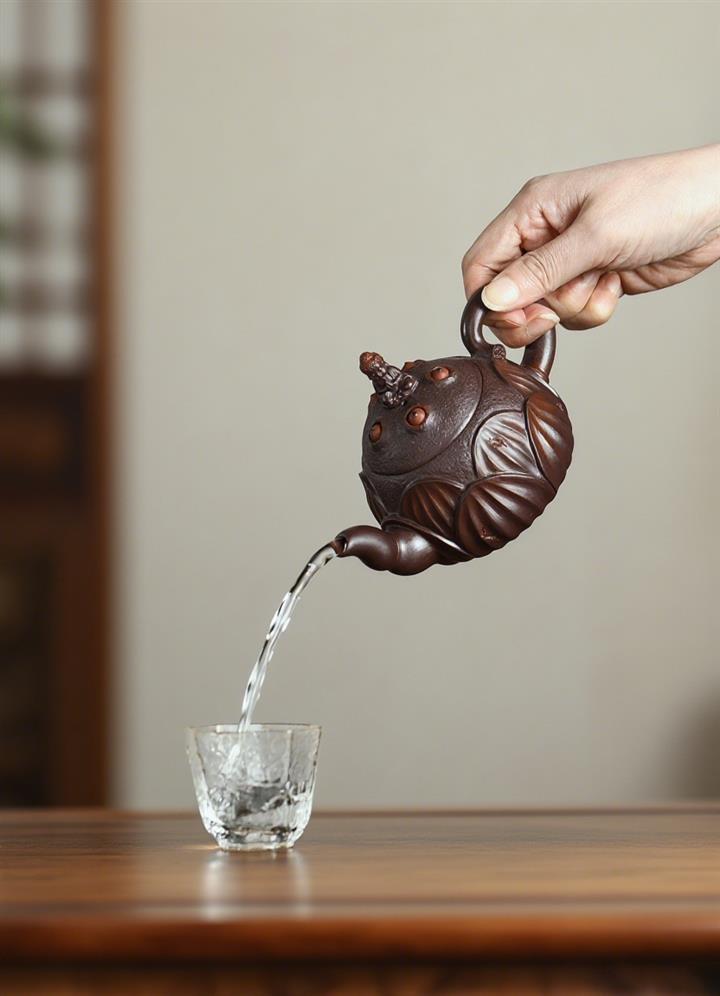【泥料特點】砂土氣重,似淳實農民,日久使用,漸露鋒芒,養成變化,溫潤莊重。紫砂是壹種雙重氣孔結構的多孔性材質,氣孔微細,密度高。用紫砂壺沏茶,不失原味,且香不渙散,得茶之真香真味。紫砂使用越久,壺身色澤越發光亮照人,氣韻溫雅。紫砂壺長久使用器身會因撫摸擦拭,變得越發溫潤光澤。