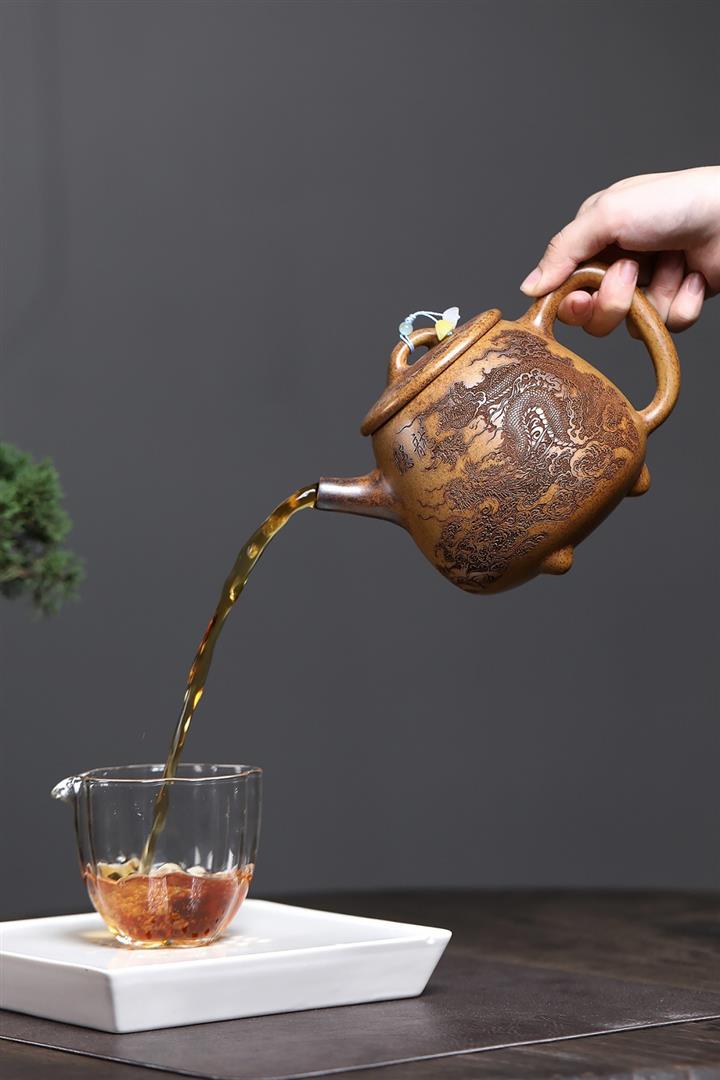 【泥料特點】砂土氣重,似淳實農民,日久使用,漸露鋒芒,養成變化,溫潤莊重。紫砂是壹種雙重氣孔結構的多孔性材質,氣孔微細,密度高。用紫砂壺沏茶,不失原味,且香不渙散,得茶之真香真味。紫砂使用越久,壺身色澤越發光亮照人,氣韻溫雅。紫砂壺長久使用器身會因撫摸擦拭,變得越發溫潤光澤。