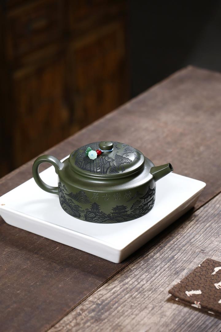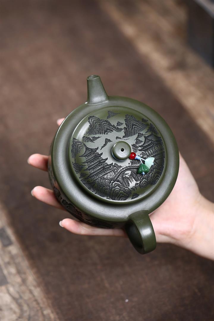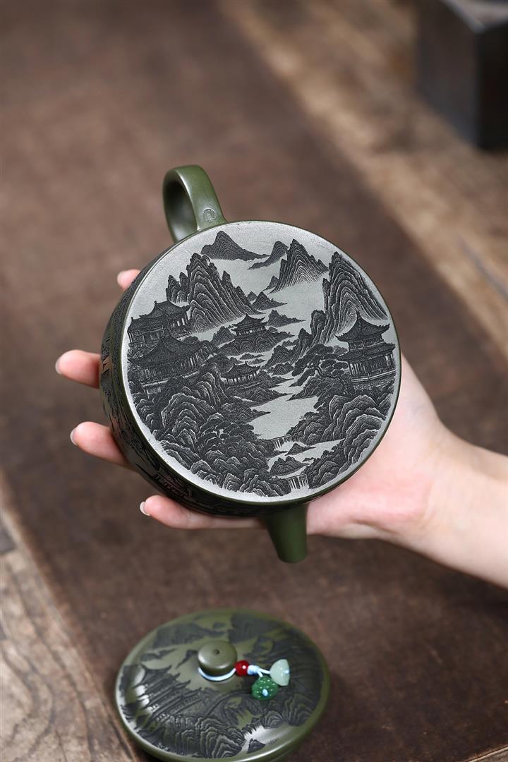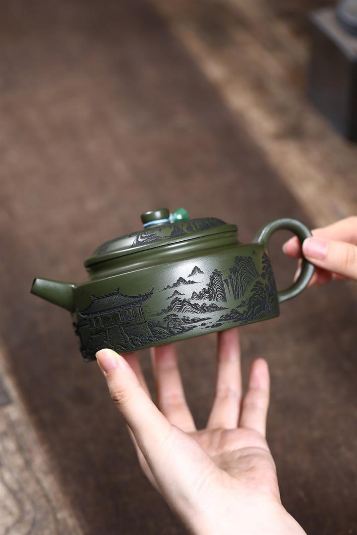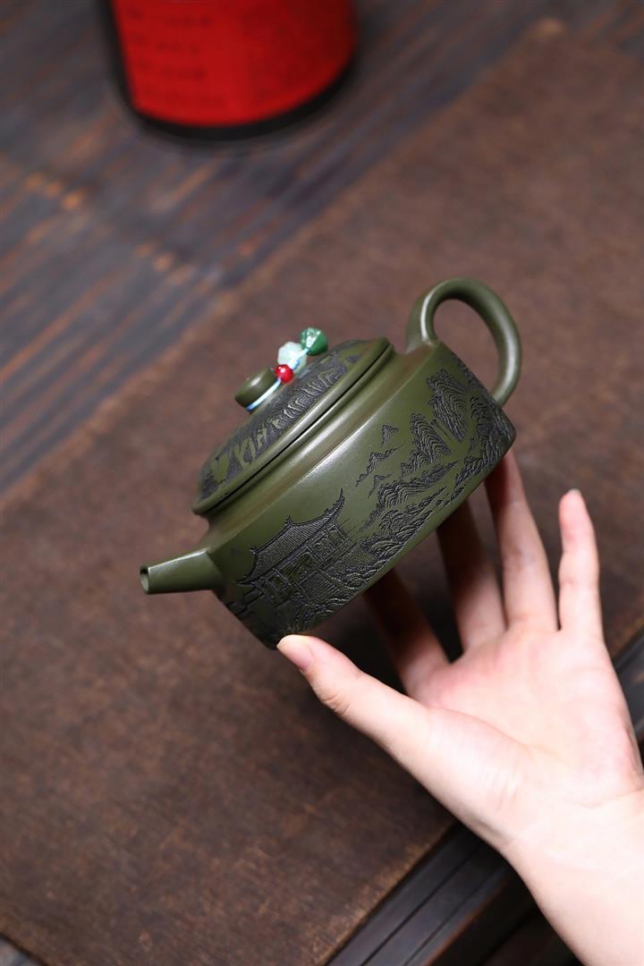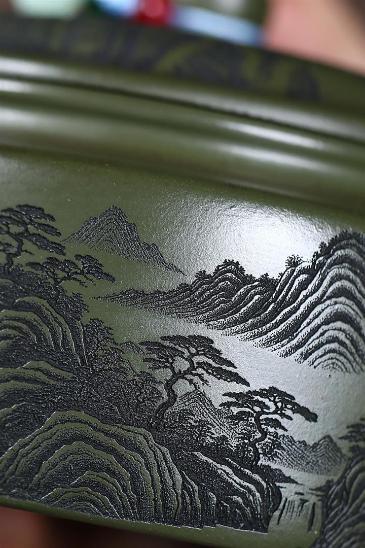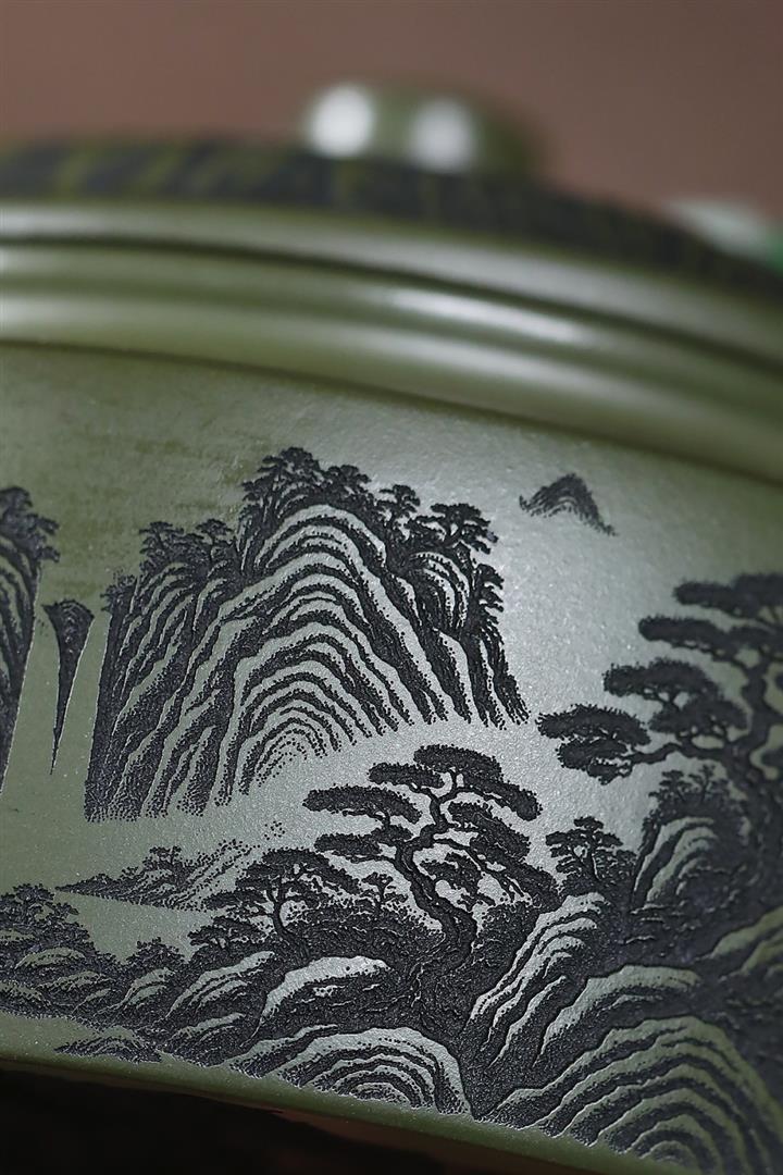 400cc原礦綠泥滿刻江山如畫壺POT7982