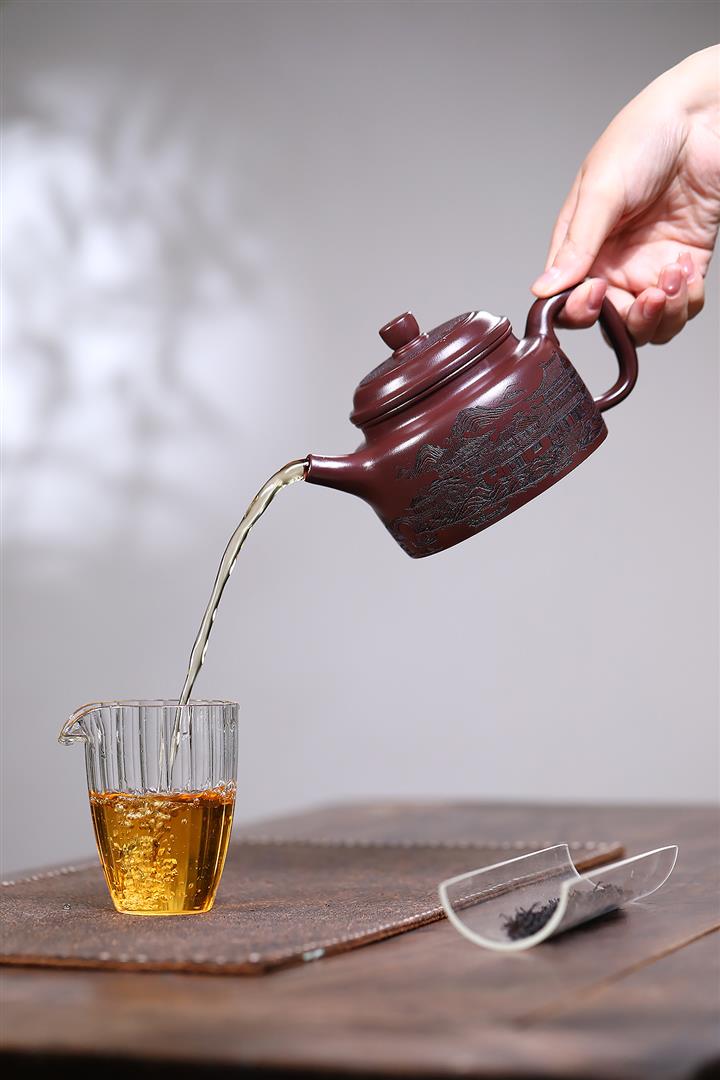 【泥料特點】砂土氣重,似淳實農民,日久使用,漸露鋒芒,養成變化,溫潤莊重。紫砂是壹種雙重氣孔結構的多孔性材質,氣孔微細,密度高。用紫砂壺沏茶,不失原味,且香不渙散,得茶之真香真味。紫砂使用越久,壺身色澤越發光亮照人,氣韻溫雅。紫砂壺長久使用器身會因撫摸擦拭,變得越發溫潤光澤。