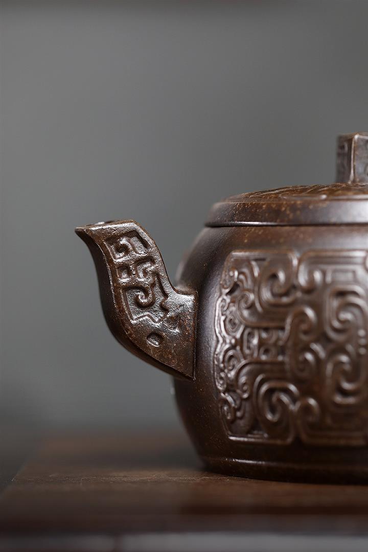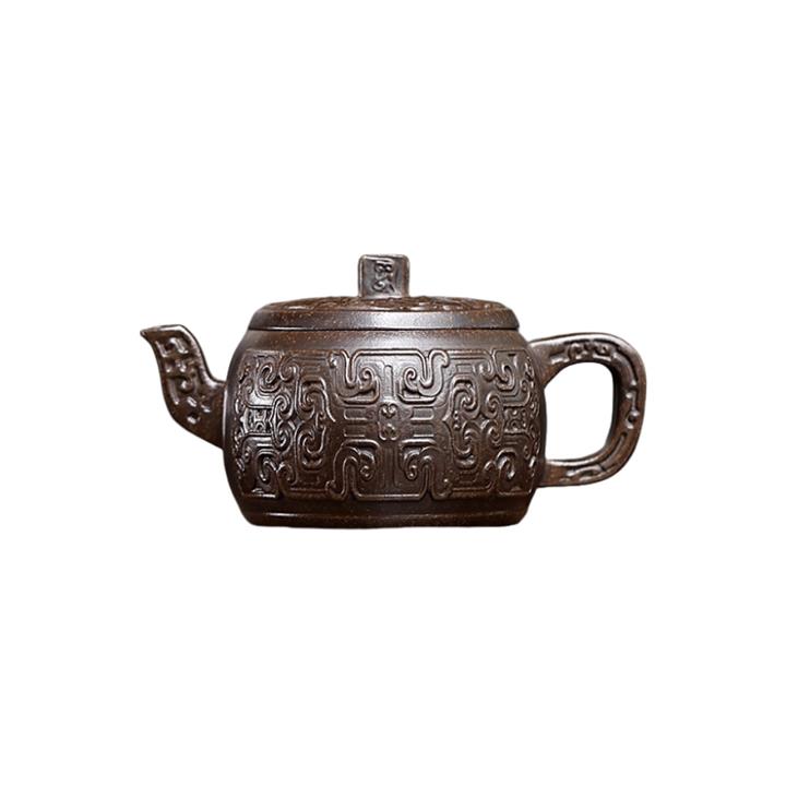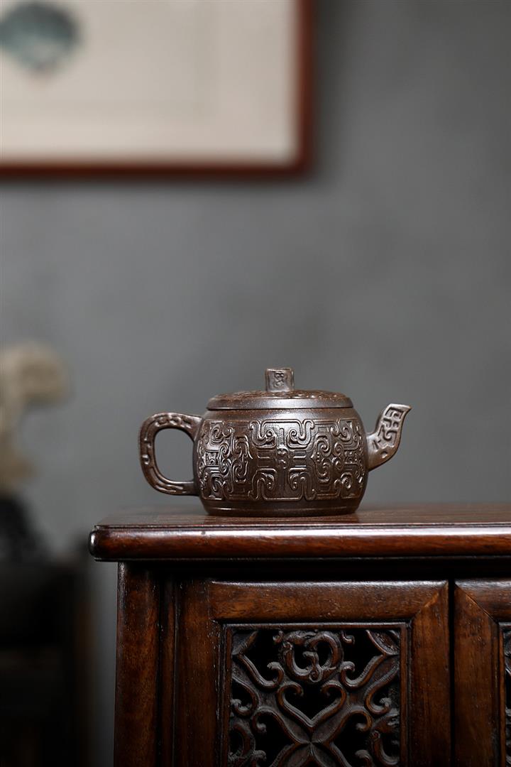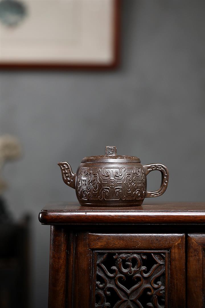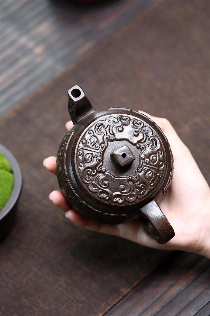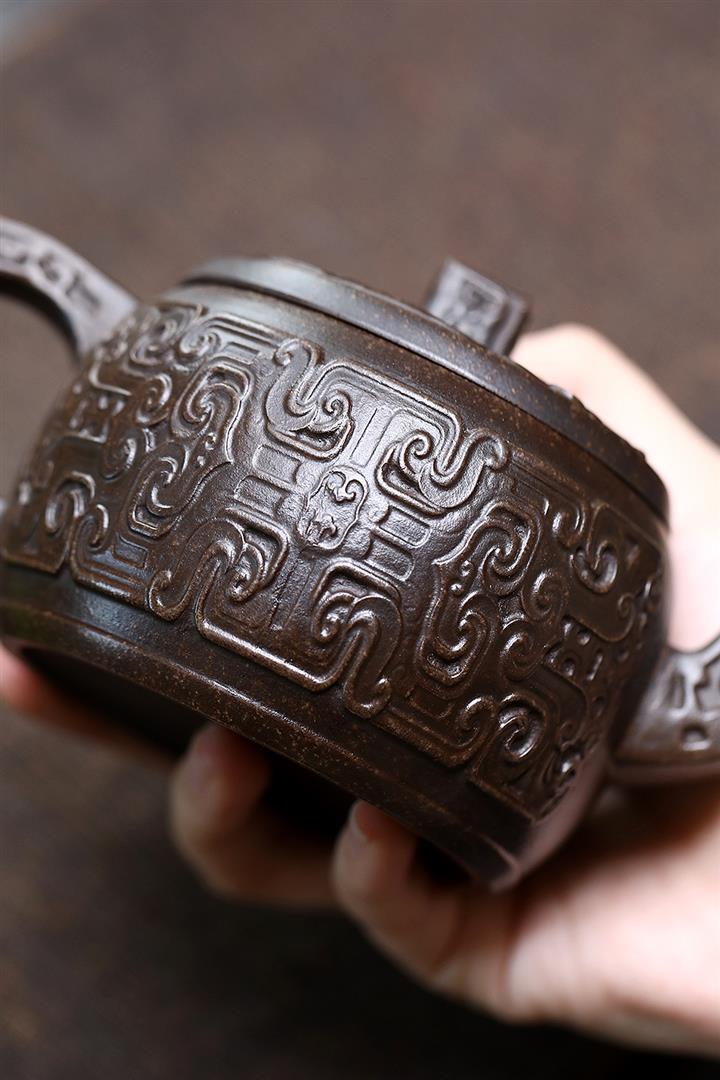 原礦墨綠泥手工滿刻觀山洋桶茶壺POT7107