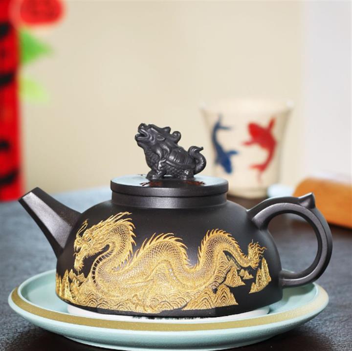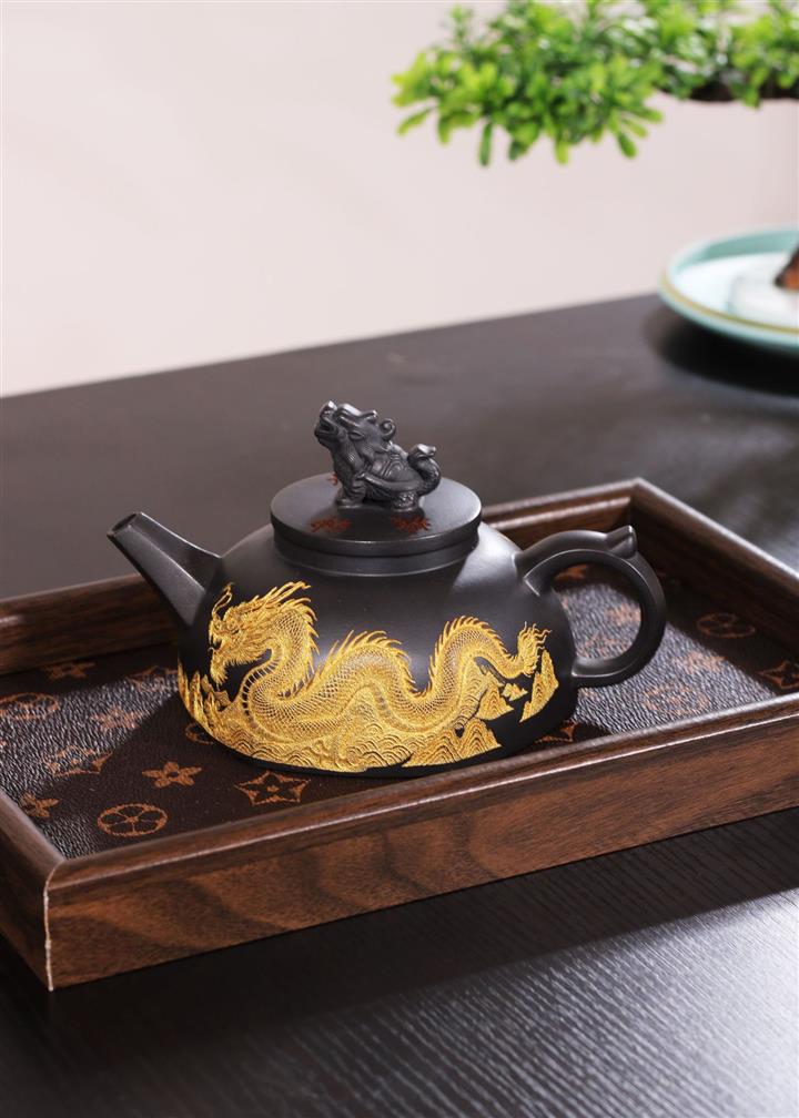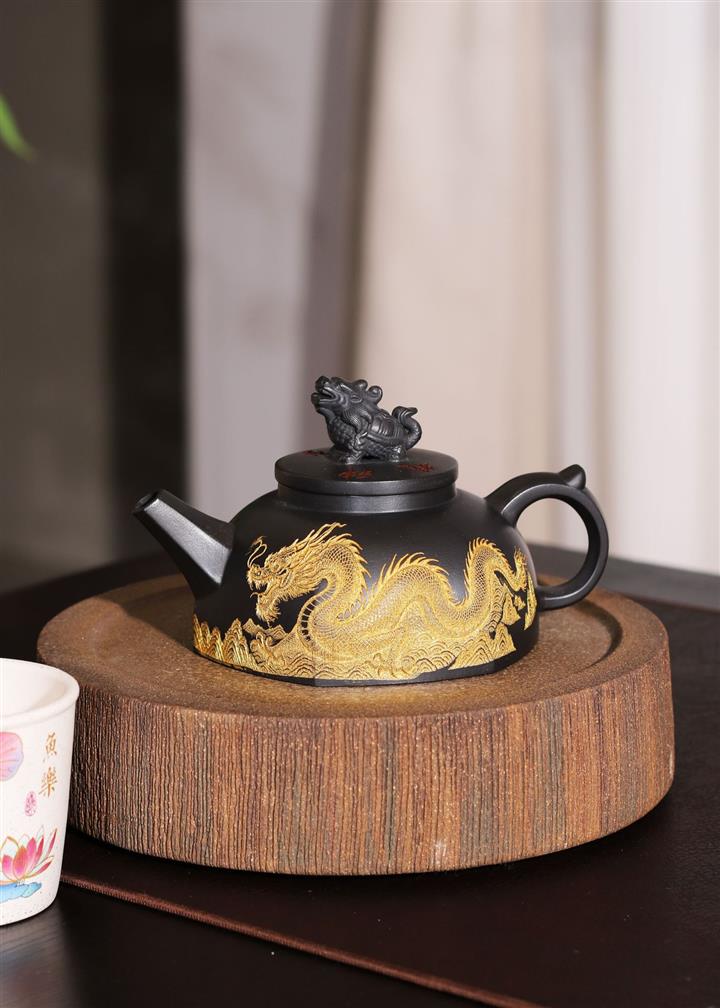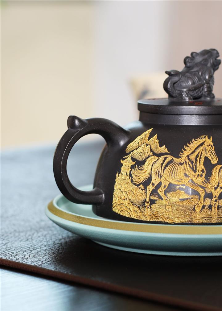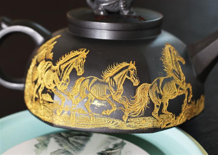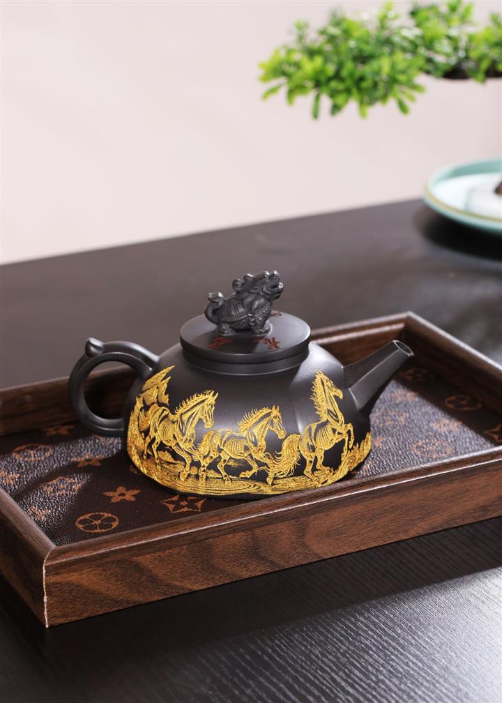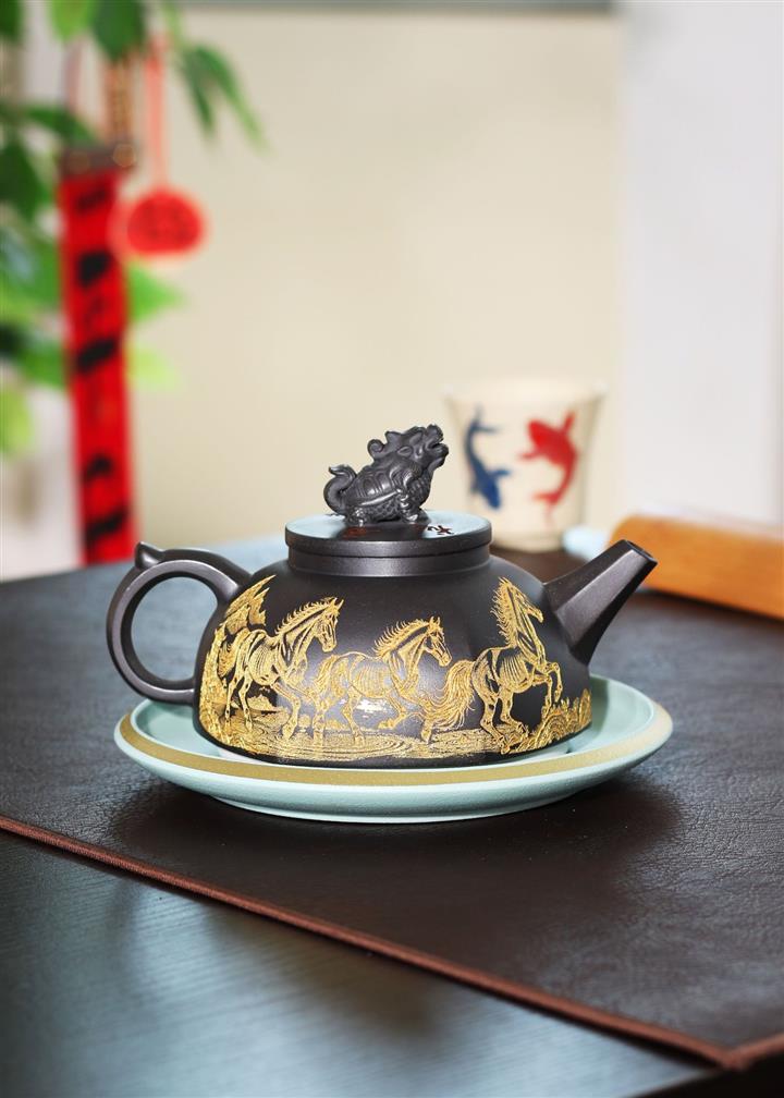 290cc玄鐵石黃黑料金刻龍馬精神茶壺POT8189
