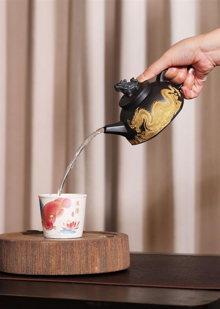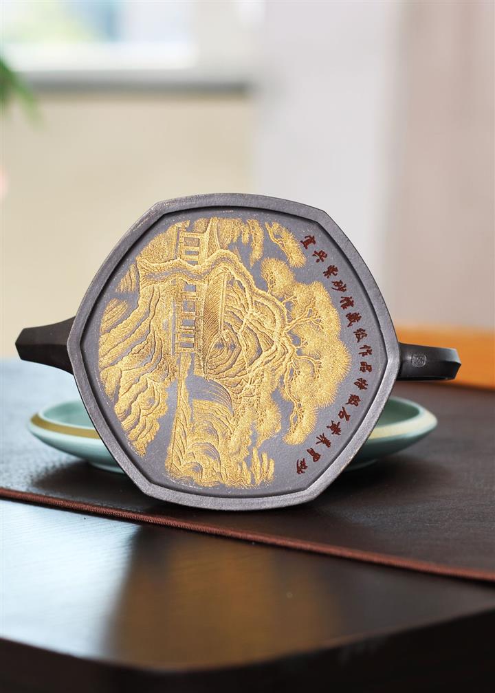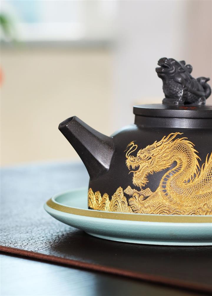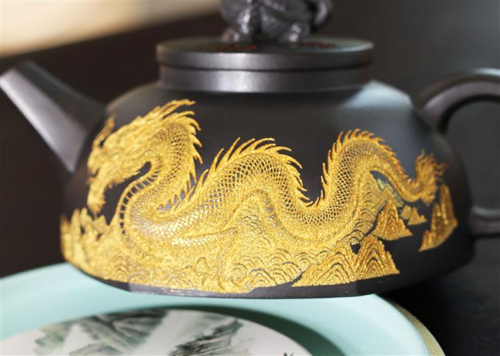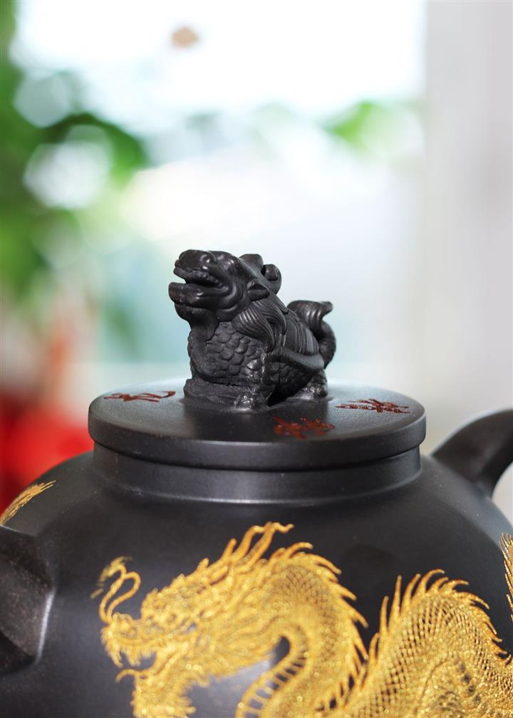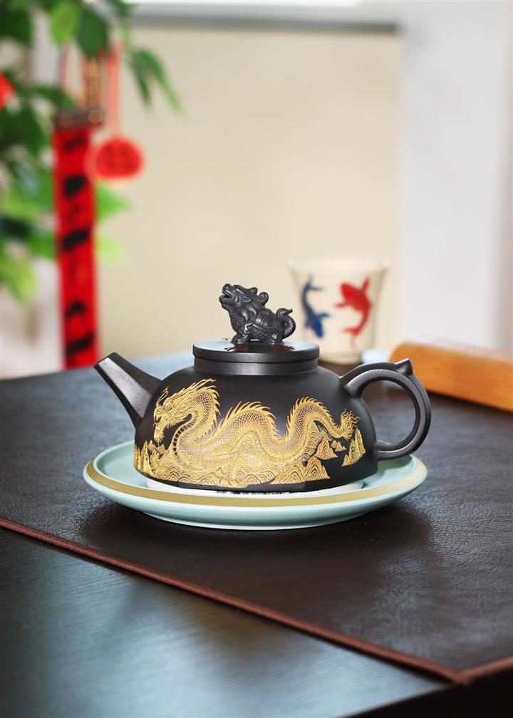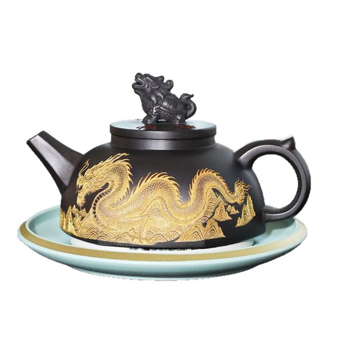 290cc玄鐵石黃黑料金刻龍馬精神茶壺POT8189