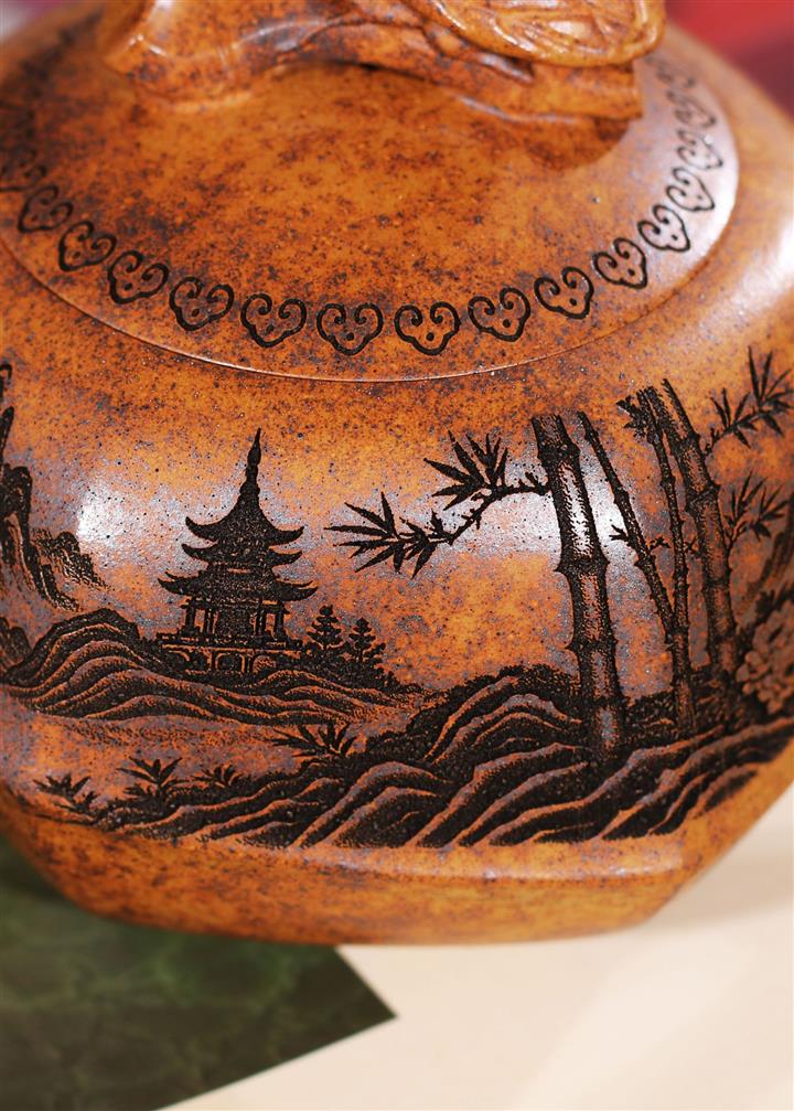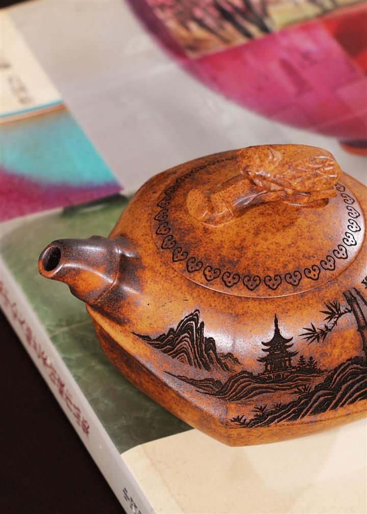 【泥料特點】砂土氣重,似淳實農民,日久使用,漸露鋒芒,養成變化,溫潤莊重。紫砂是壹種雙重氣孔結構的多孔性材質,氣孔微細,密度高。用紫砂壺沏茶,不失原味,且香不渙散,得茶之真香真味。紫砂使用越久,壺身色澤越發光亮照人,氣韻溫雅。紫砂壺長久使用器身會因撫摸擦拭,變得越發溫潤光澤。