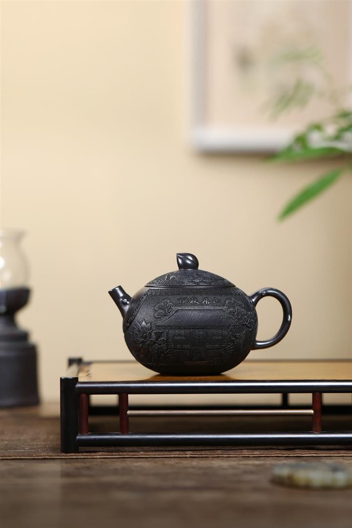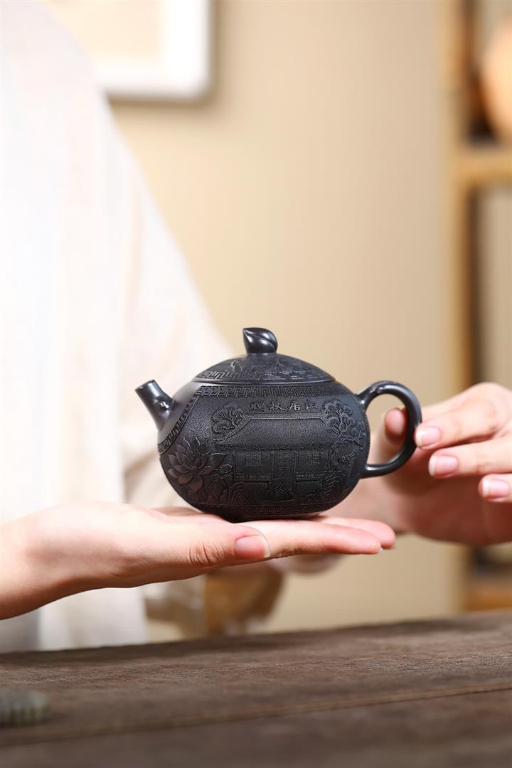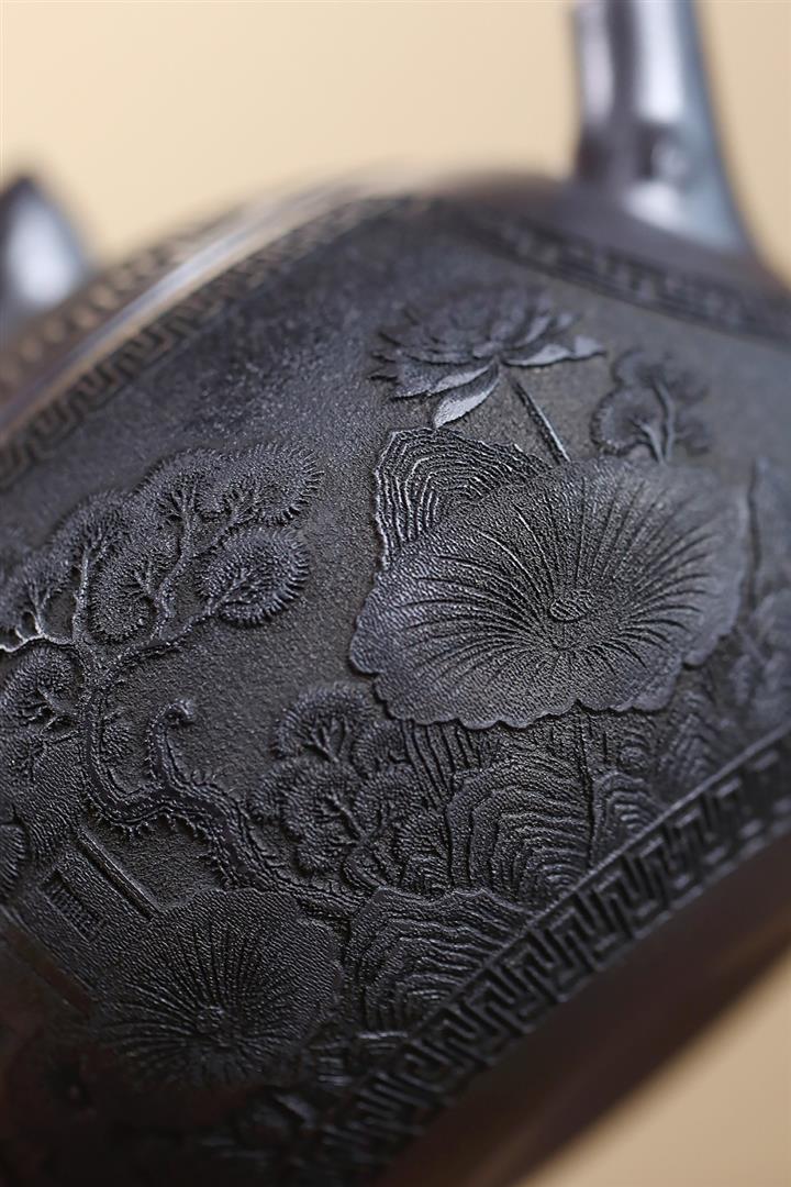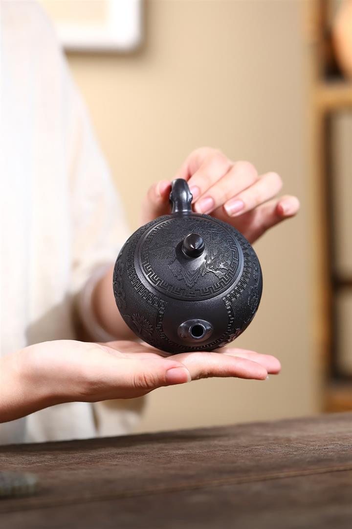 原礦黑泥彩繪仙鶴龍龜茶壺POT6832