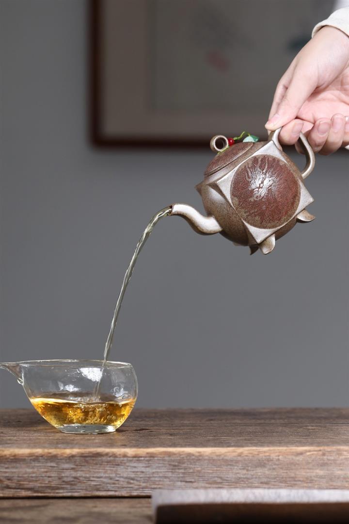 【泥料特點】砂土氣重,似淳實農民,日久使用,漸露鋒芒,養成變化,溫潤莊重。紫砂是壹種雙重氣孔結構的多孔性材質,氣孔微細,密度高。用紫砂壺沏茶,不失原味,且香不渙散,得茶之真香真味。紫砂使用越久,壺身色澤越發光亮照人,氣韻溫雅。紫砂壺長久使用器身會因撫摸擦拭,變得越發溫潤光澤。