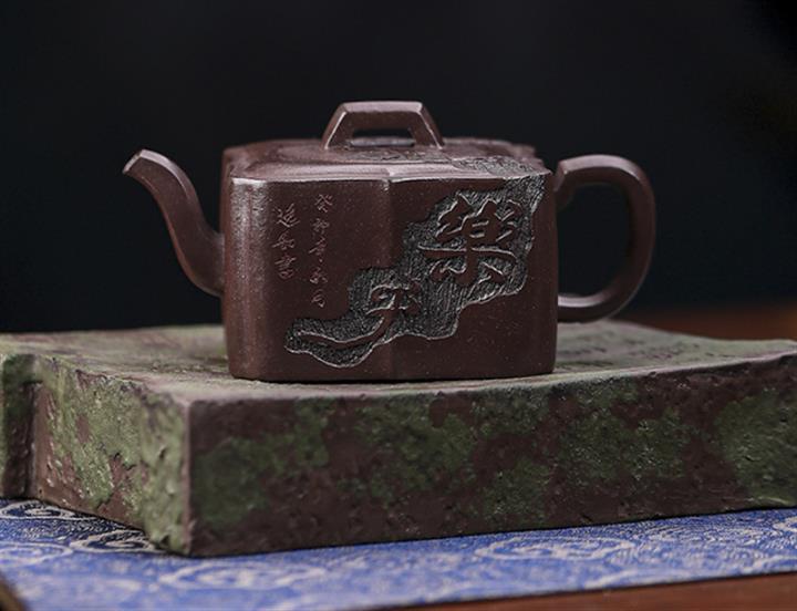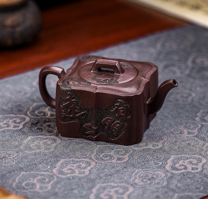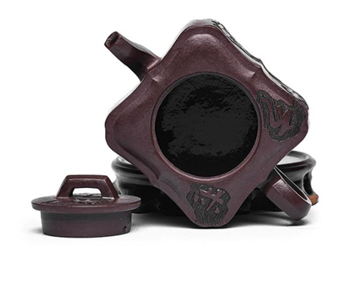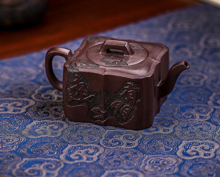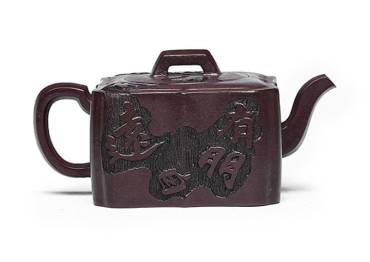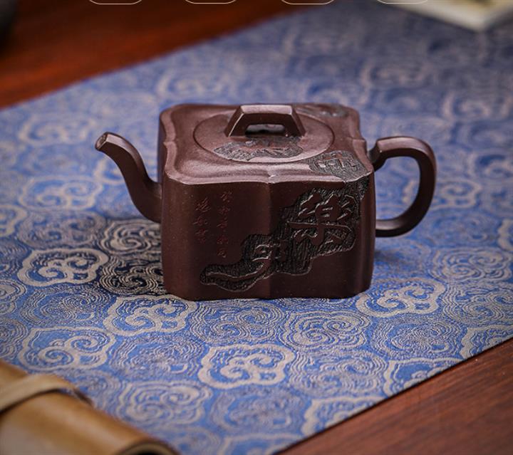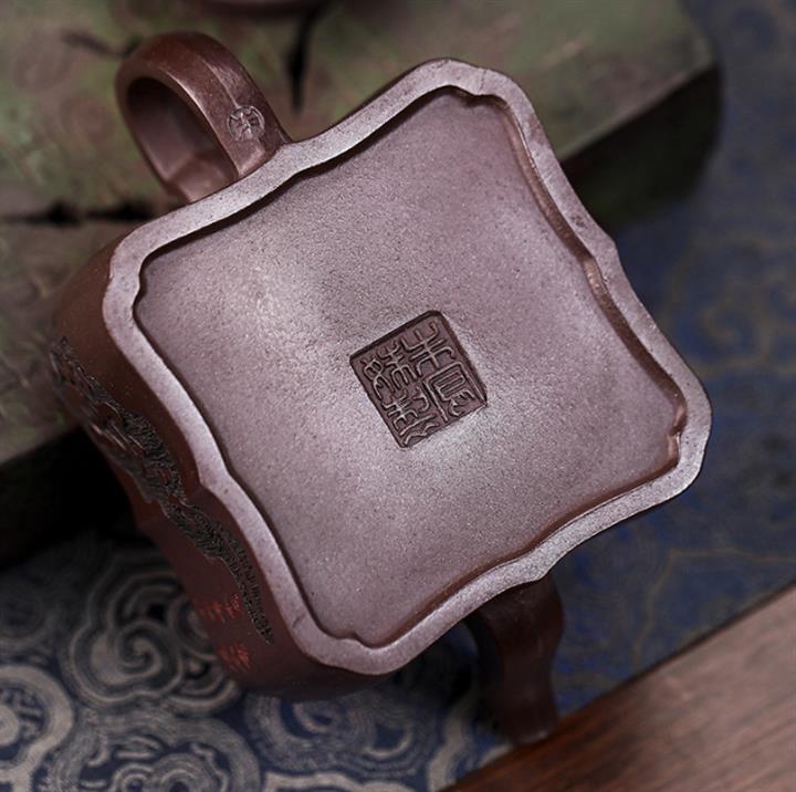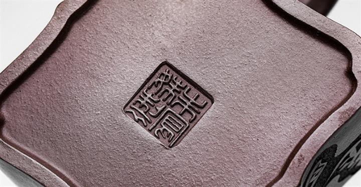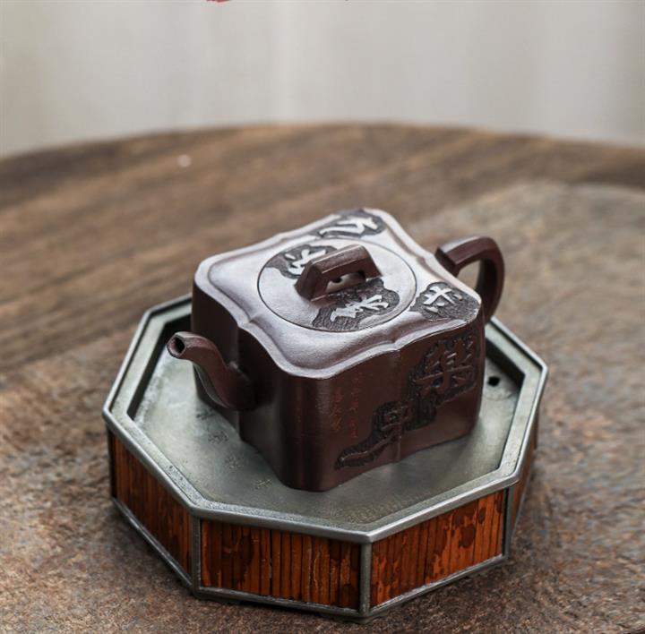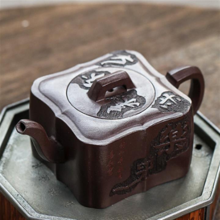 原礦紫泥手工刻字畫馬上封侯四方壺POT6737