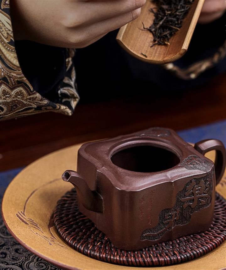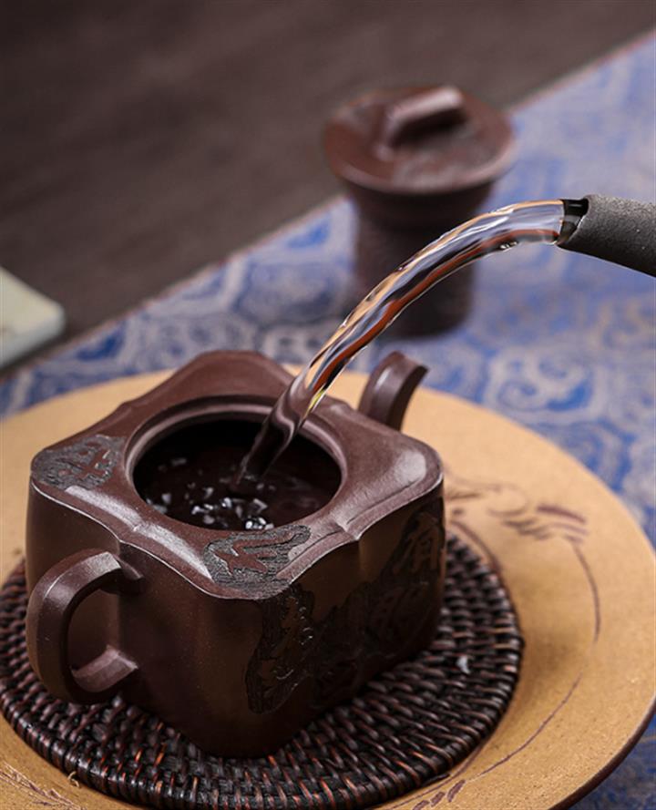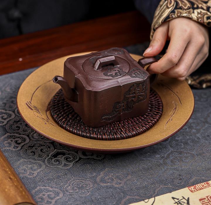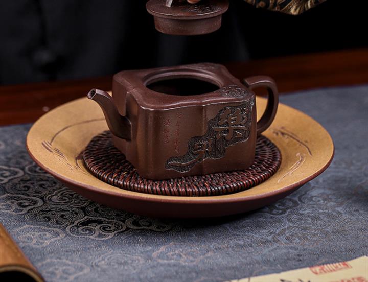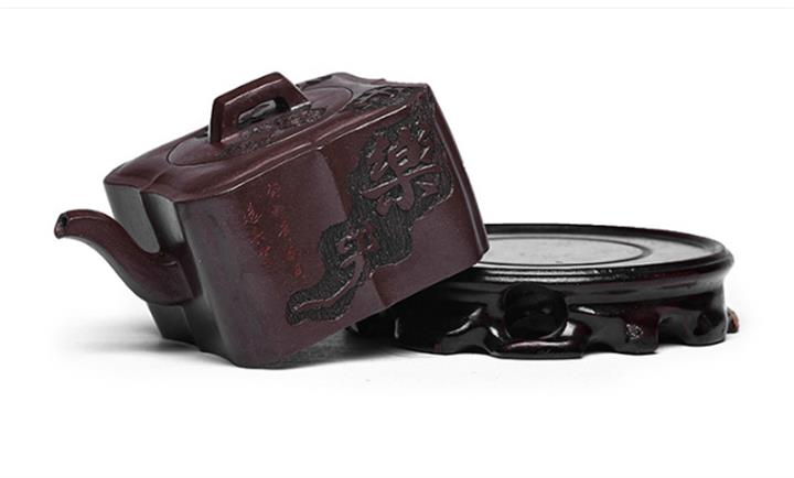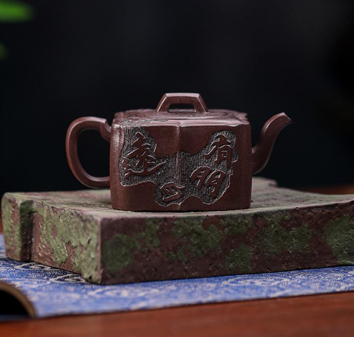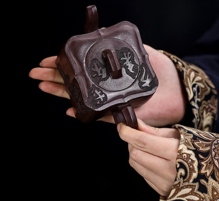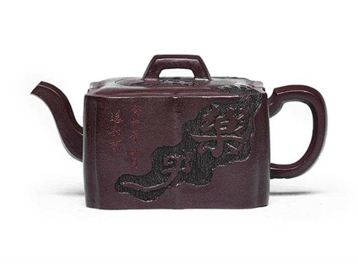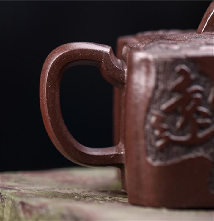 原礦紫泥手工刻字畫馬上封侯四方壺POT6737