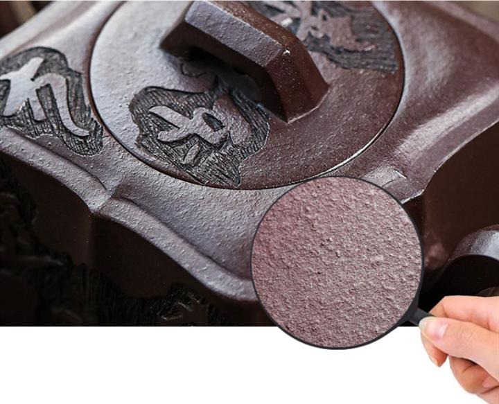 【泥料特點】砂土氣重,似淳實農民,日久使用,漸露鋒芒,養成變化,溫潤莊重。紫砂是壹種雙重氣孔結構的多孔性材質,氣孔微細,密度高。用紫砂壺沏茶,不失原味,且香不渙散,得茶之真香真味。紫砂使用越久,壺身色澤越發光亮照人,氣韻溫雅。紫砂壺長久使用器身會因撫摸擦拭,變得越發溫潤光澤。