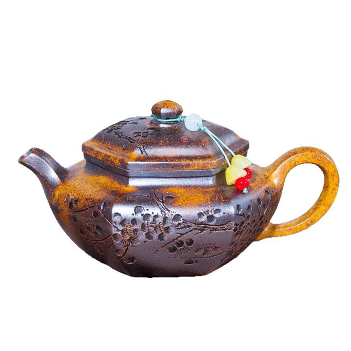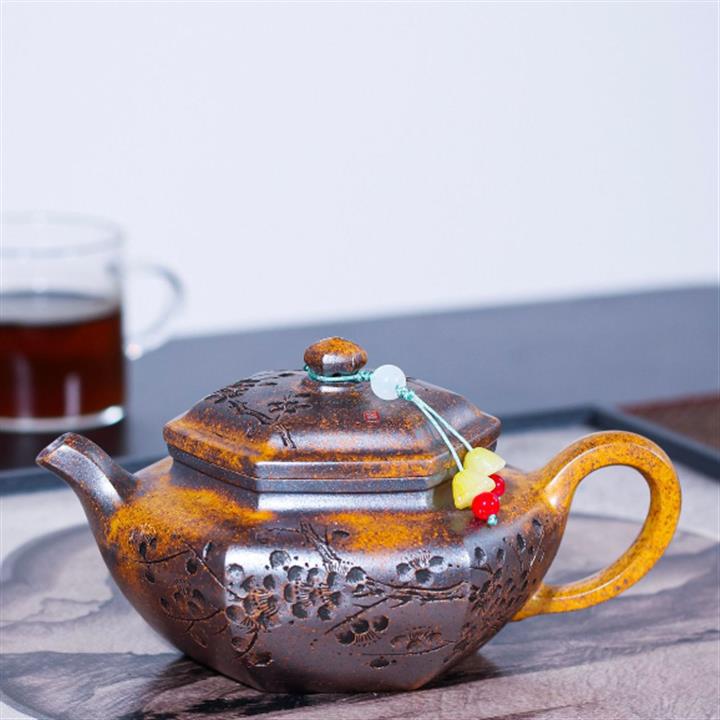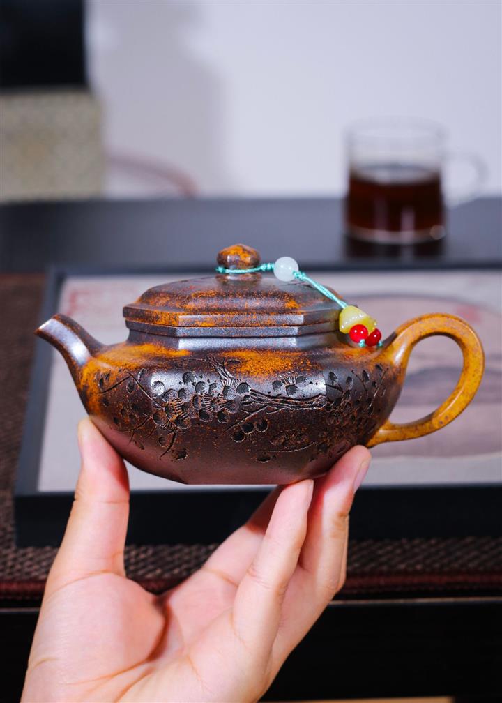 【泥料特點】砂土氣重,似淳實農民,日久使用,漸露鋒芒,養成變化,溫潤莊重。紫砂是壹種雙重氣孔結構的多孔性材質,氣孔微細,密度高。用紫砂壺沏茶,不失原味,且香不渙散,得茶之真香真味。紫砂使用越久,壺身色澤越發光亮照人,氣韻溫雅。紫砂壺長久使用器身會因撫摸擦拭,變得越發溫潤光澤。