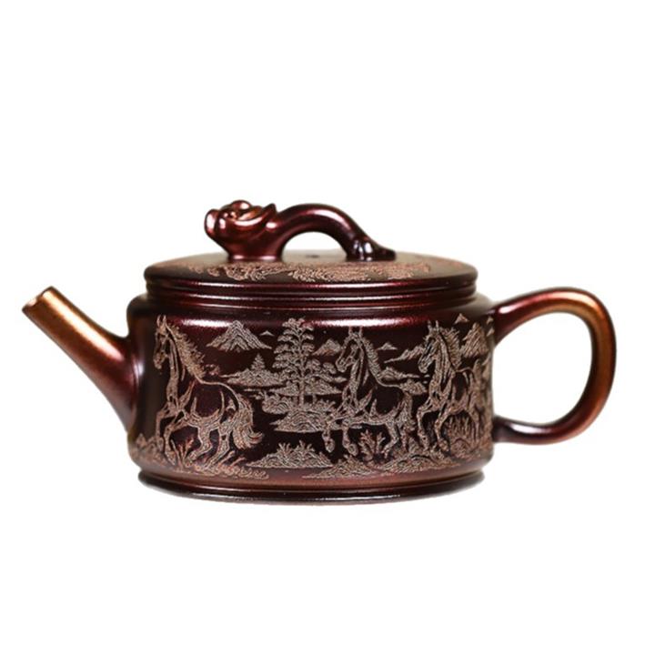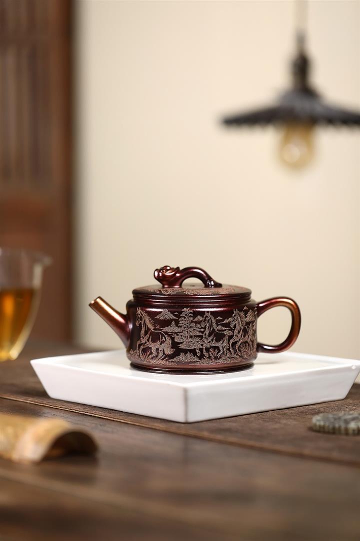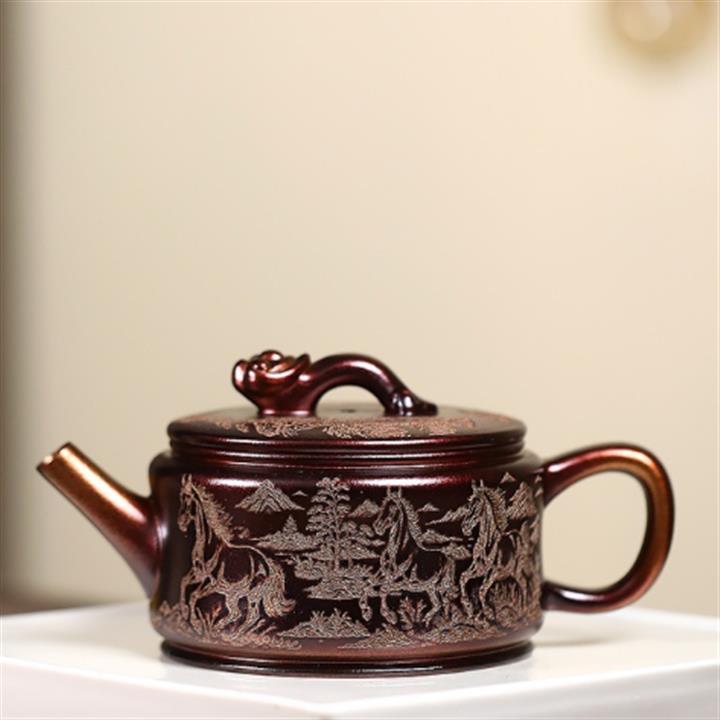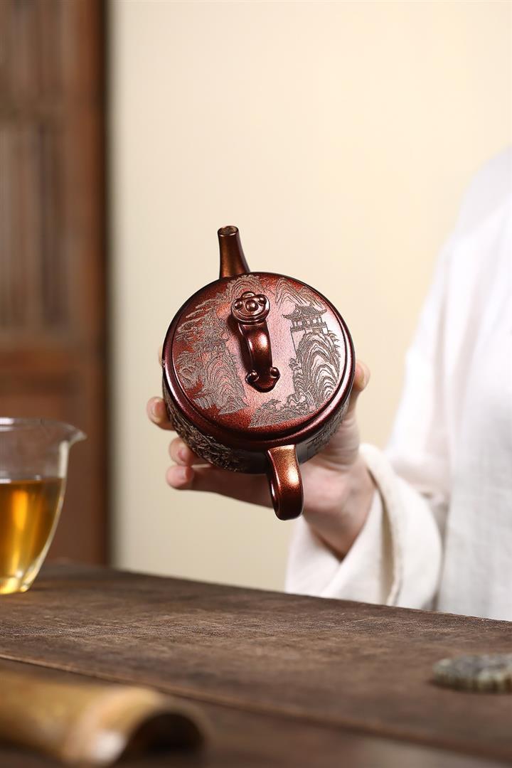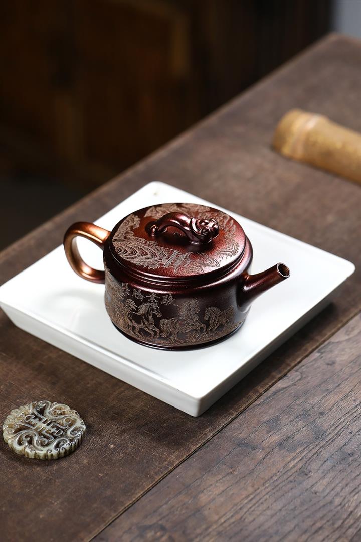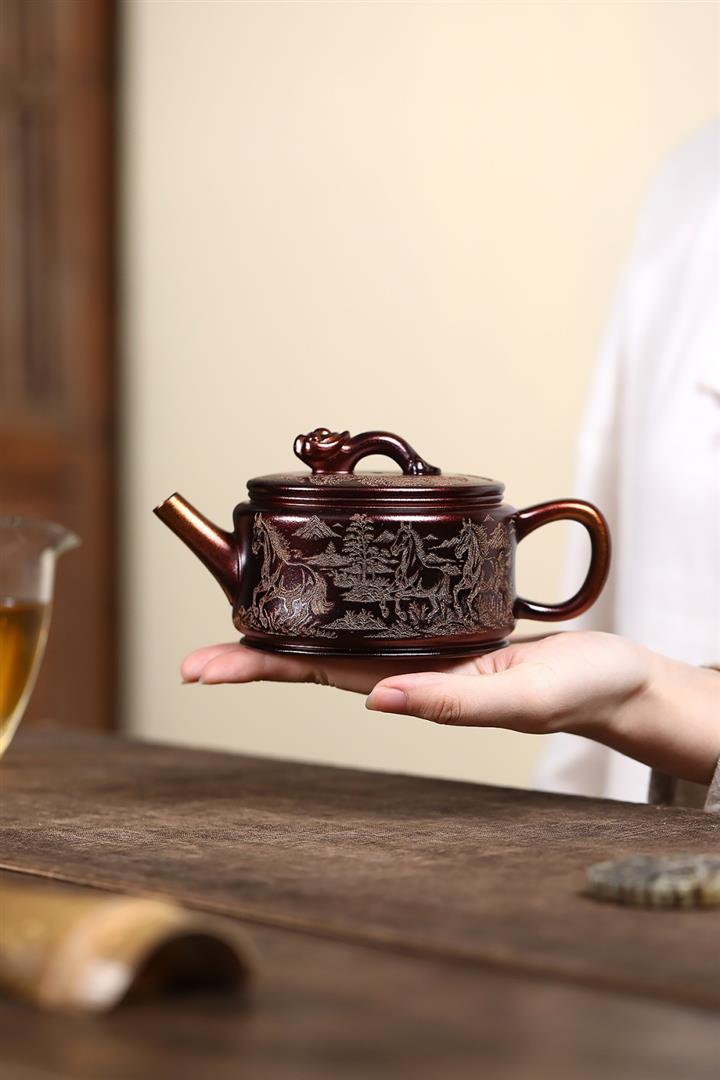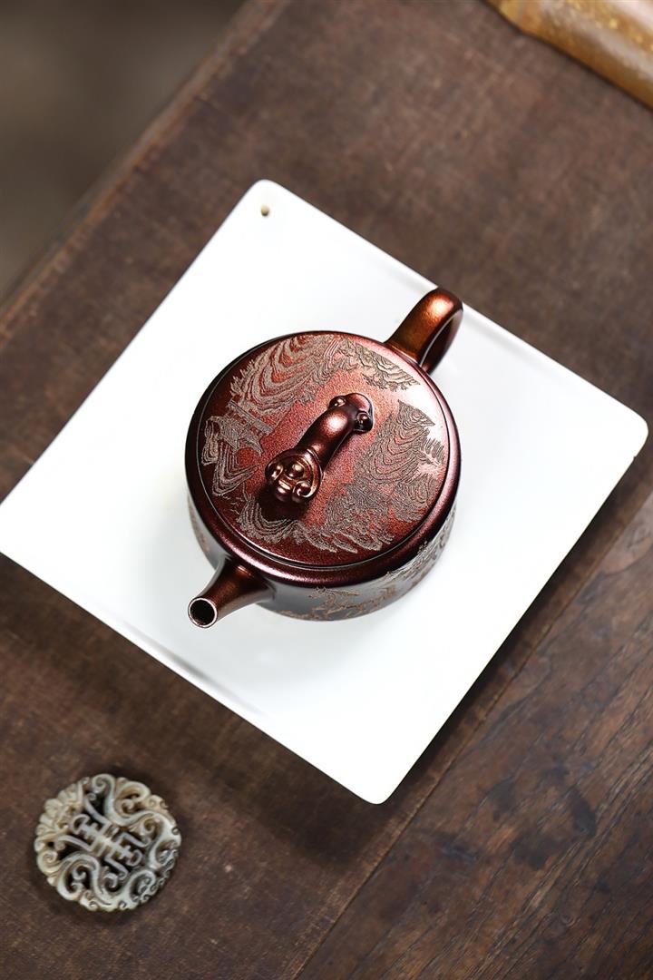 原礦古銅泥滿刻寒江茶壺POT7174