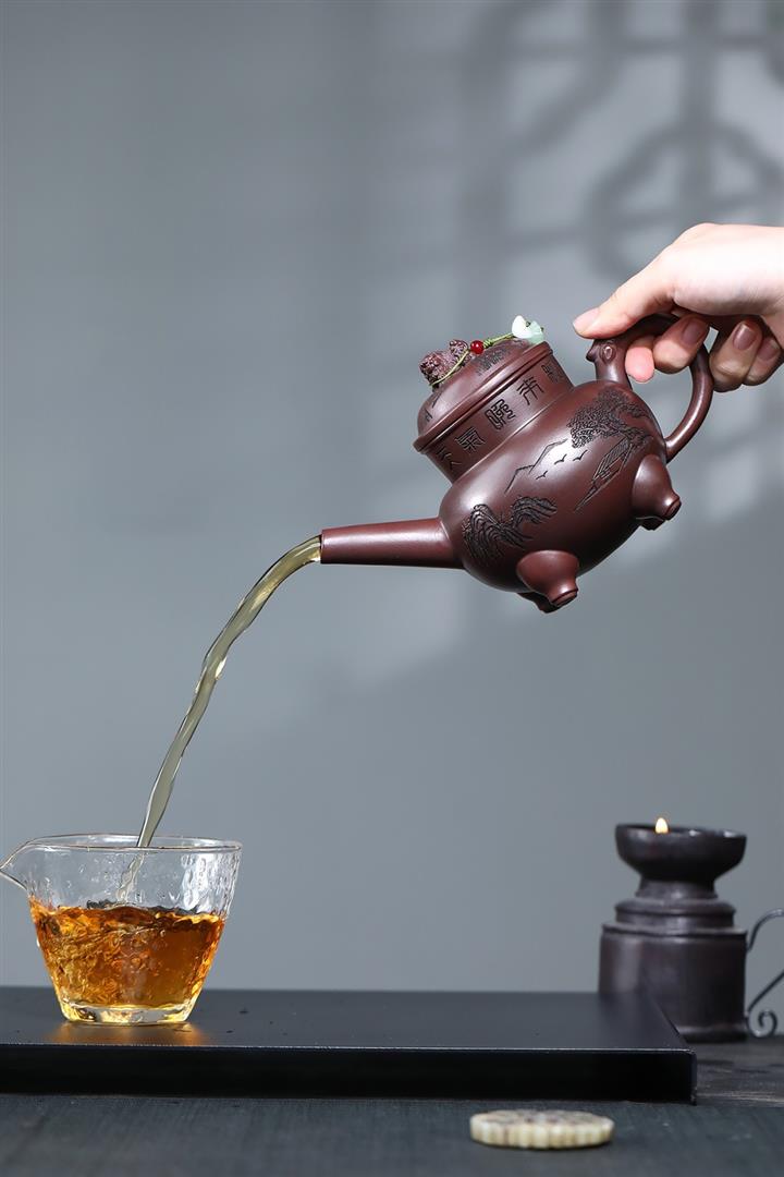 【泥料特點】砂土氣重,似淳實農民,日久使用,漸露鋒芒,養成變化,溫潤莊重。紫砂是壹種雙重氣孔結構的多孔性材質,氣孔微細,密度高。用紫砂壺沏茶,不失原味,且香不渙散,得茶之真香真味。紫砂使用越久,壺身色澤越發光亮照人,氣韻溫雅。紫砂壺長久使用器身會因撫摸擦拭,變得越發溫潤光澤。