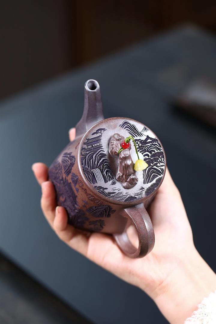 【作品介紹】此款壺形線條流暢,壺把,壺嘴,壺身壹氣呵成栩栩如生,是收藏把玩的好壺,泥料色澤古樸典雅,日久使用,漸露鋒芒,養成變化快,溫潤莊重,用其泡茶,使用的年代久,壺身就溫潤,泡出來的茶湯也就醇郁芳馨。