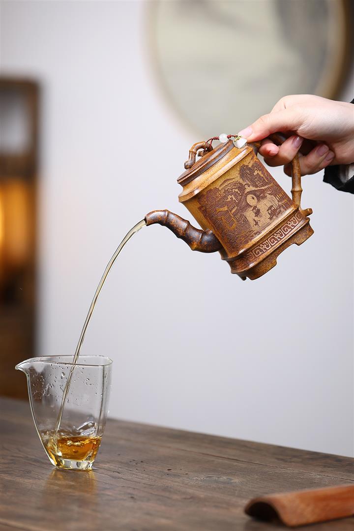 【泥料特點】砂土氣重,似淳實農民,日久使用,漸露鋒芒,養成變化,溫潤莊重。紫砂是壹種雙重氣孔結構的多孔性材質,氣孔微細,密度高。用紫砂壺沏茶,不失原味,且香不渙散,得茶之真香真味。紫砂使用越久,壺身色澤越發光亮照人,氣韻溫雅。紫砂壺長久使用器身會因撫摸擦拭,變得越發溫潤光澤。
