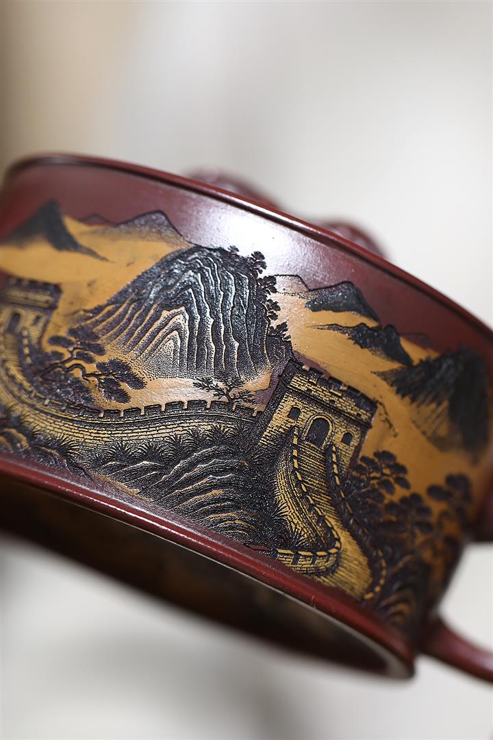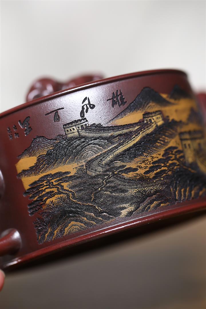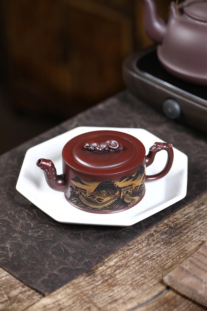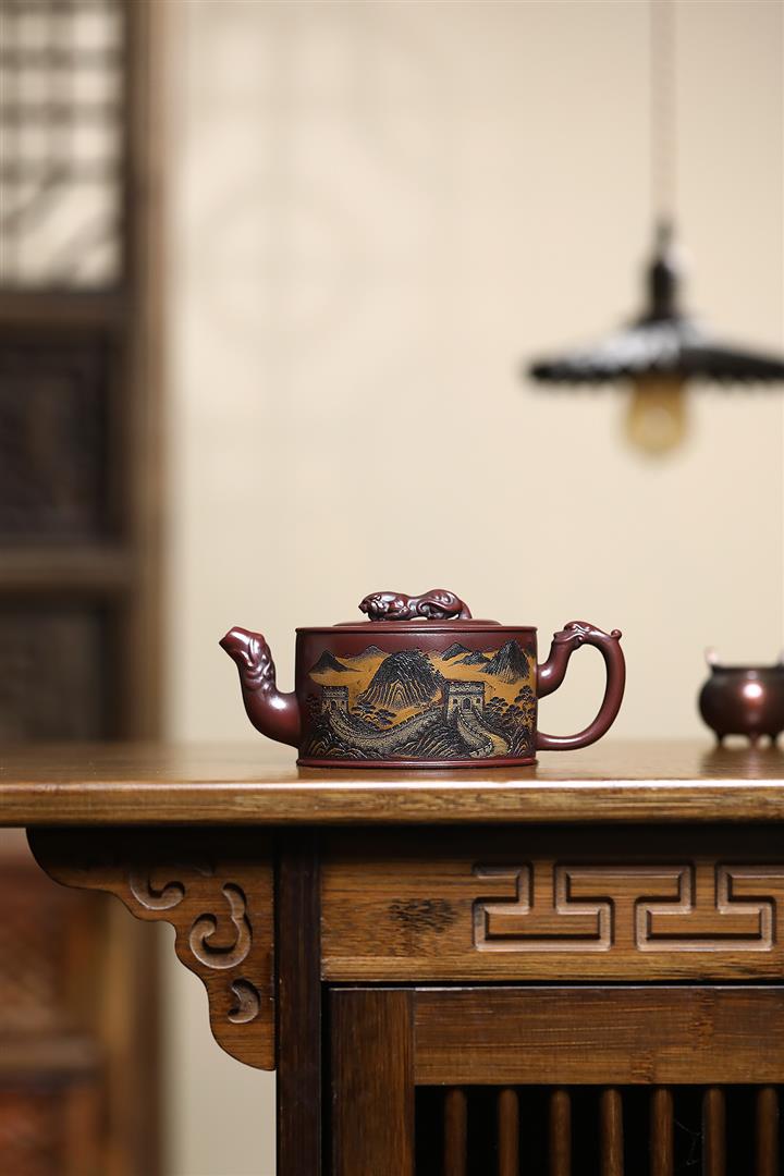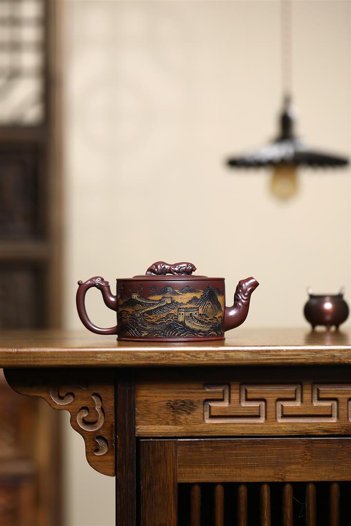 320cc原礦古烏泥萬裏長城彩刻伏虎茶壺POT8723