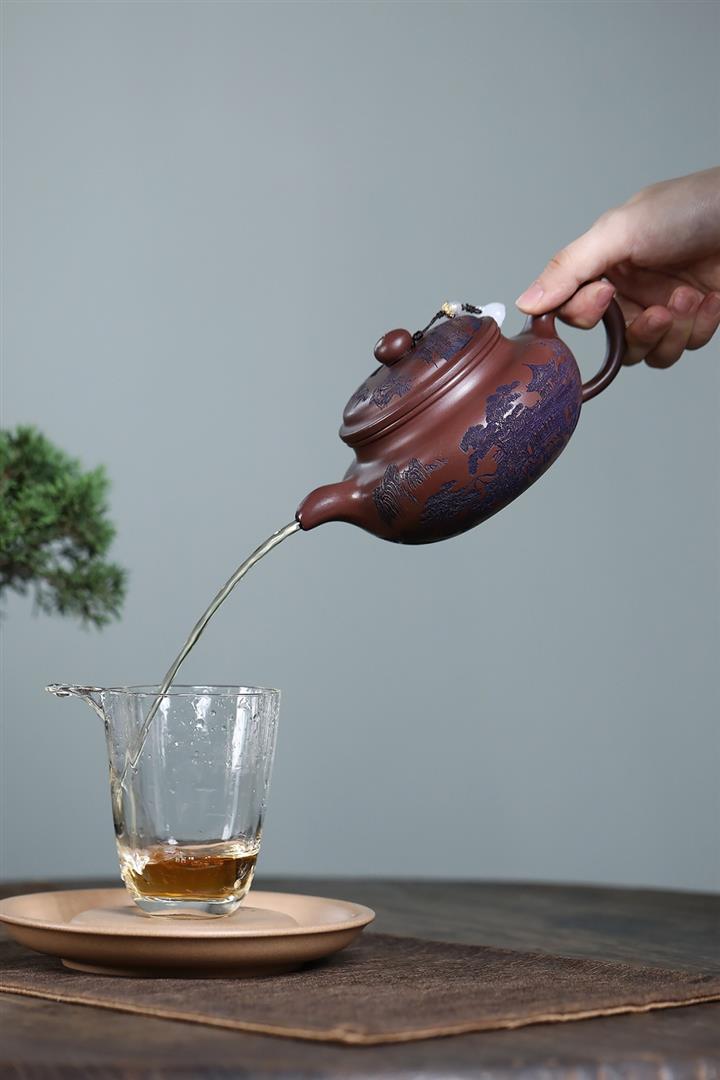 【泥料特點】砂土氣重,似淳實農民,日久使用,漸露鋒芒,養成變化,溫潤莊重。紫砂是壹種雙重氣孔結構的多孔性材質,氣孔微細,密度高。用紫砂壺沏茶,不失原味,且香不渙散,得茶之真香真味。紫砂使用越久,壺身色澤越發光亮照人,氣韻溫雅。紫砂壺長久使用器身會因撫摸擦拭,變得越發溫潤光澤。