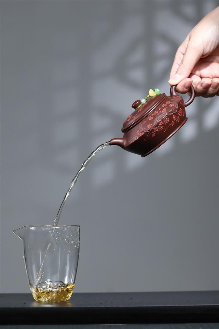 【泥料特點】砂土氣重,似淳實農民,日久使用,漸露鋒芒,養成變化,溫潤莊重。紫砂是壹種雙重氣孔結構的多孔性材質,氣孔微細,密度高。用紫砂壺沏茶,不失原味,且香不渙散,得茶之真香真味。紫砂使用越久,壺身色澤越發光亮照人,氣韻溫雅。紫砂壺長久使用器身會因撫摸擦拭,變得越發溫潤光澤。