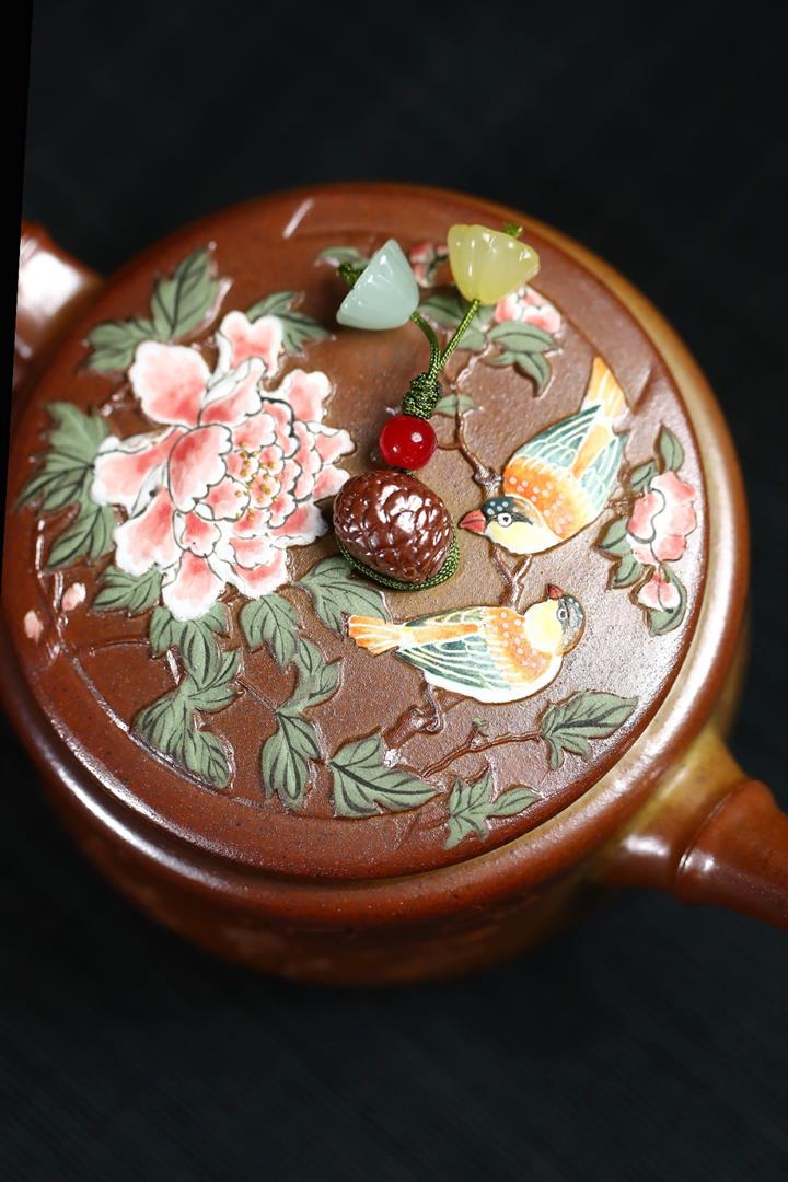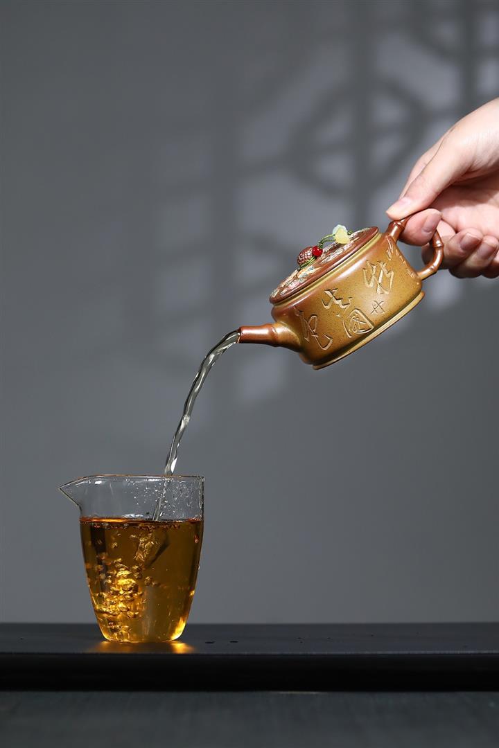 【泥料特點】砂土氣重,似淳實農民,日久使用,漸露鋒芒,養成變化,溫潤莊重。紫砂是壹種雙重氣孔結構的多孔性材質,氣孔微細,密度高。用紫砂壺沏茶,不失原味,且香不渙散,得茶之真香真味。紫砂使用越久,壺身色澤越發光亮照人,氣韻溫雅。紫砂壺長久使用器身會因撫摸擦拭,變得越發溫潤光澤。