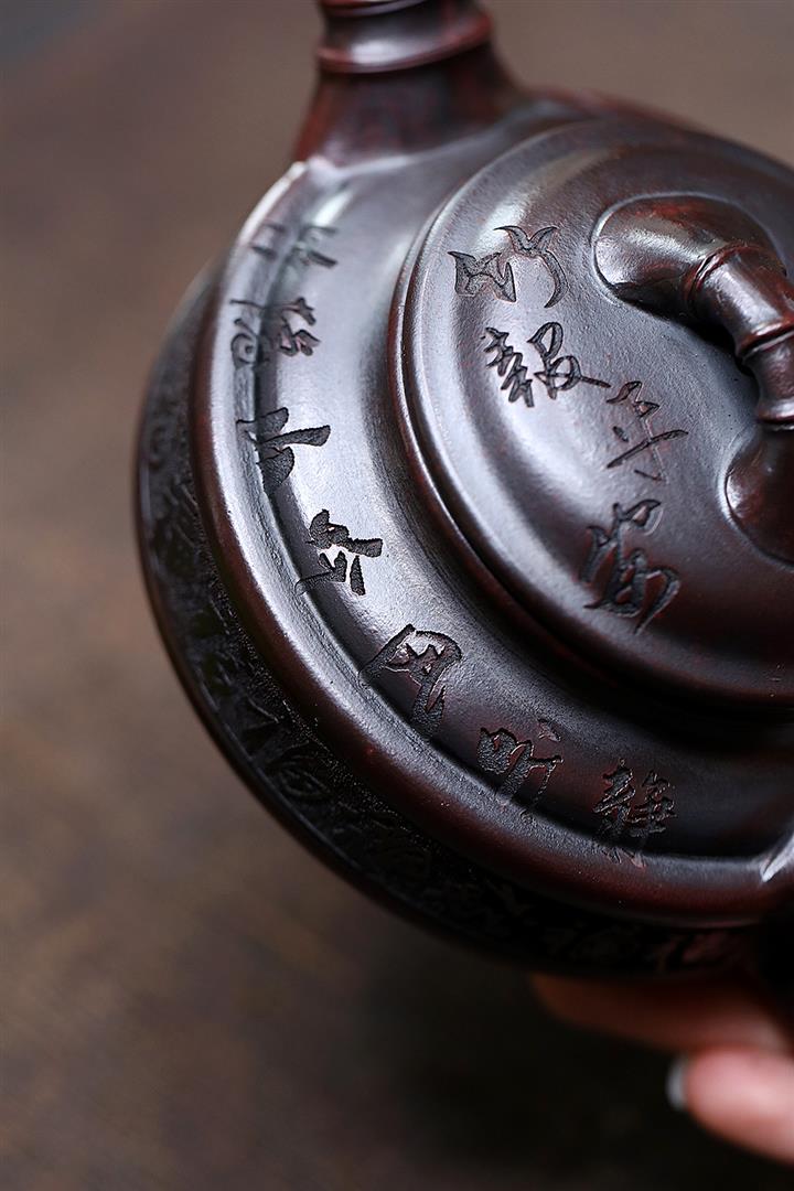 230cc原礦紫泥滿刻寬圓丹羽壺POT8097