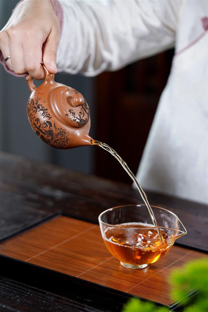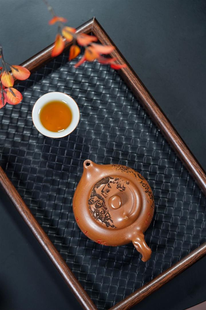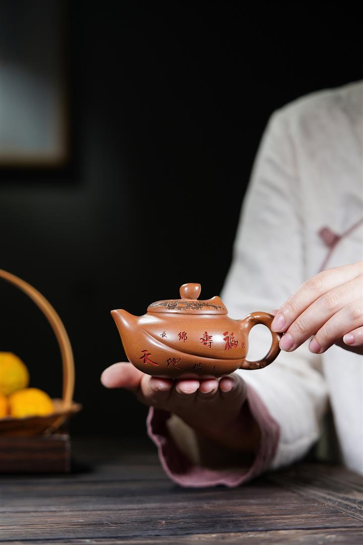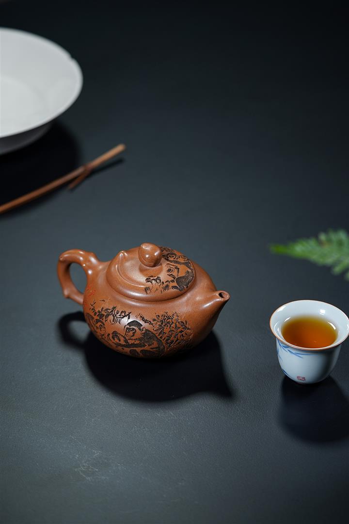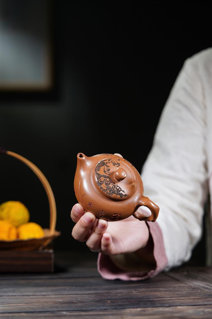【泥料特點】砂土氣重,似淳實農民,日久使用,漸露鋒芒,養成變化,溫潤莊重。紫砂是壹種雙重氣孔結構的多孔性材質,氣孔微細,密度高。用紫砂壺沏茶,不失原味,且香不渙散,得茶之真香真味。紫砂使用越久,壺身色澤越發光亮照人,氣韻溫雅。紫砂壺長久使用器身會因撫摸擦拭,變得越發溫潤光澤。
