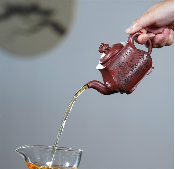【泥料特點】砂土氣重,似淳實農民,日久使用,漸露鋒芒,養成變化,溫潤莊重。紫砂是壹種雙重氣孔結構的多孔性材質,氣孔微細,密度高。用紫砂壺沏茶,不失原味,且香不渙散,得茶之真香真味。紫砂使用越久,壺身色澤越發光亮照人,氣韻溫雅。紫砂壺長久使用器身會因撫摸擦拭,變得越發溫潤光澤。