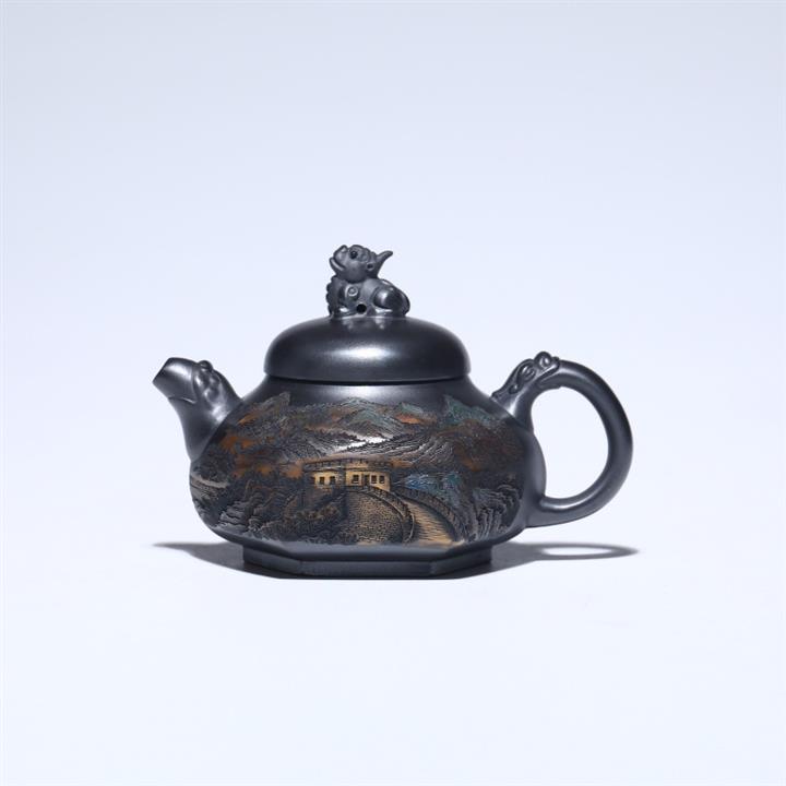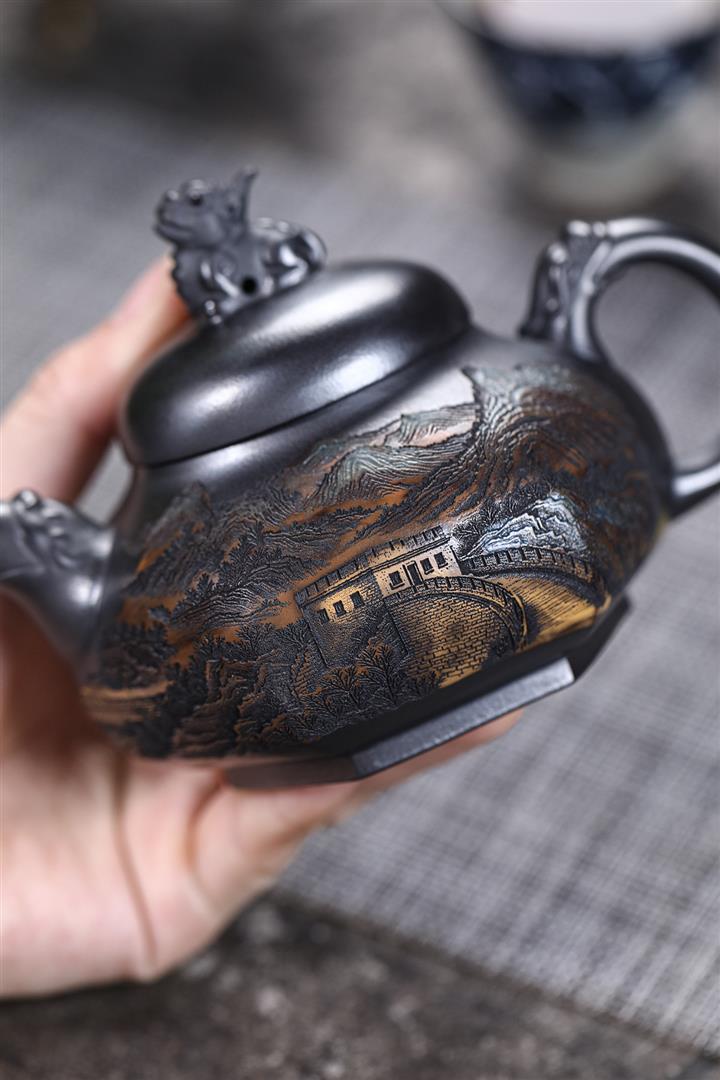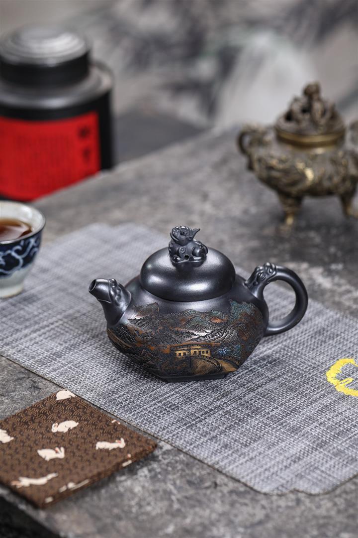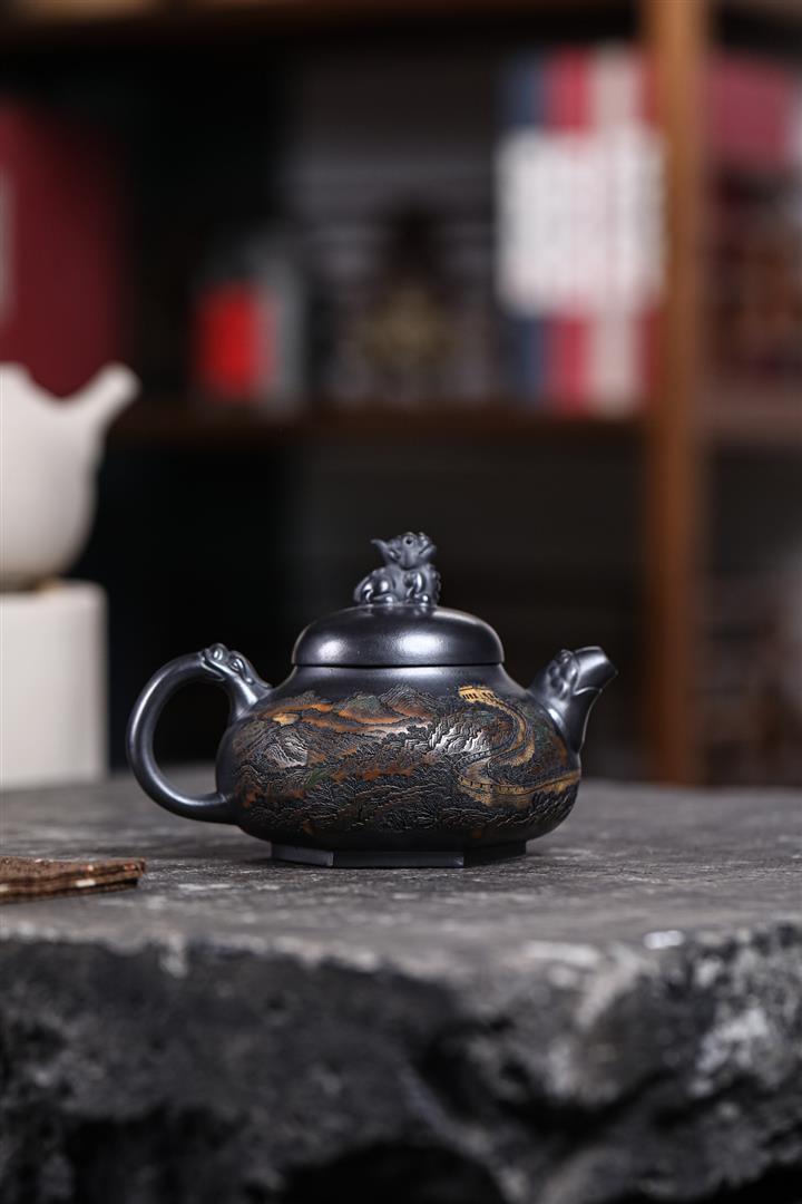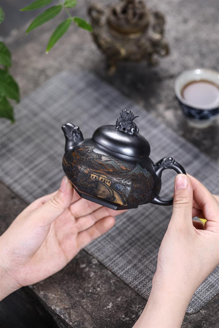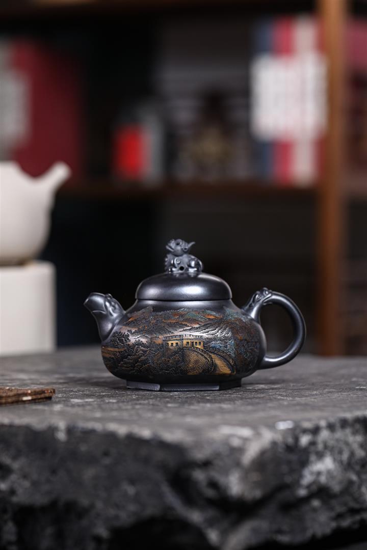 紫砂壺溪山映景茶壺全手工刻畫山水圖泡茶壺POT2108