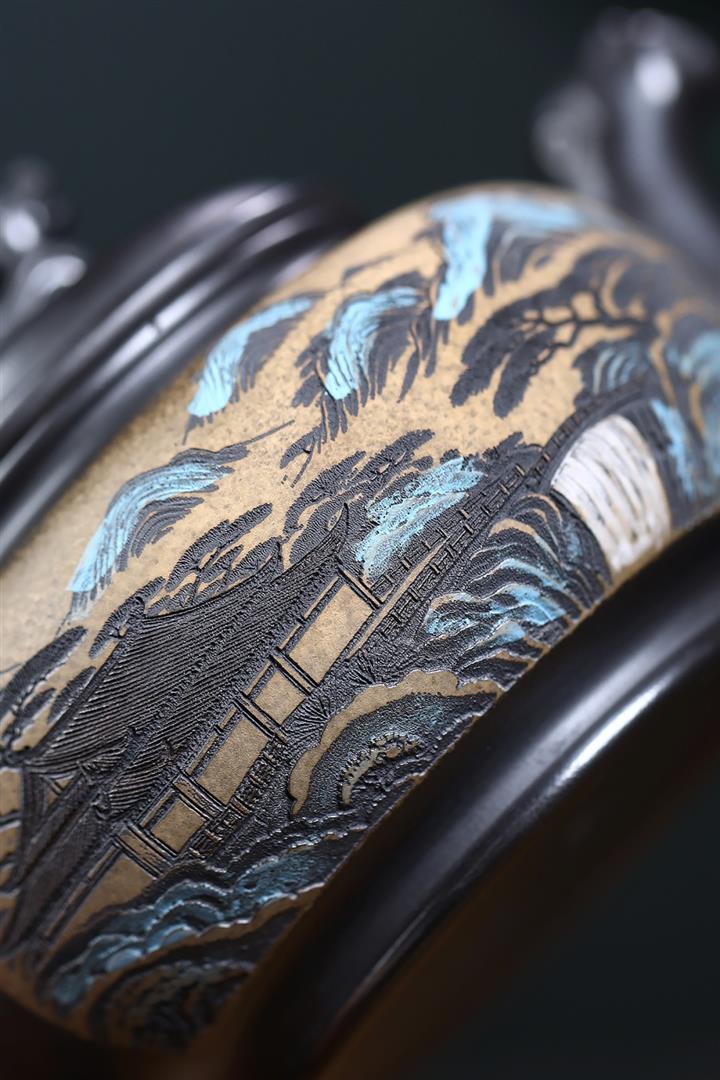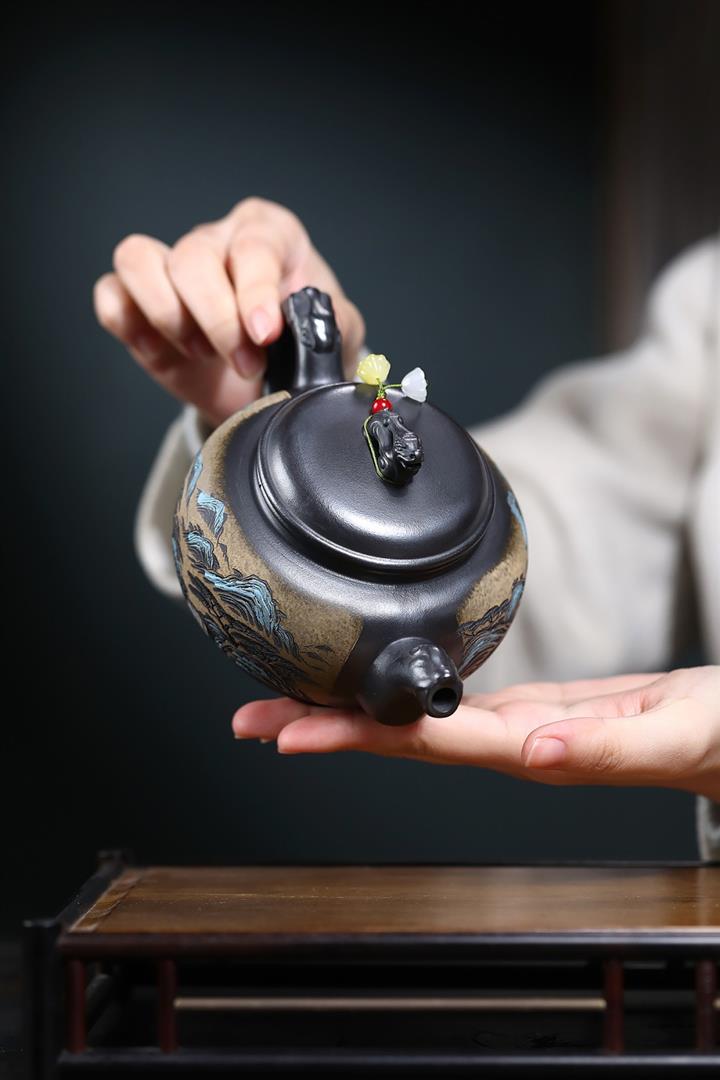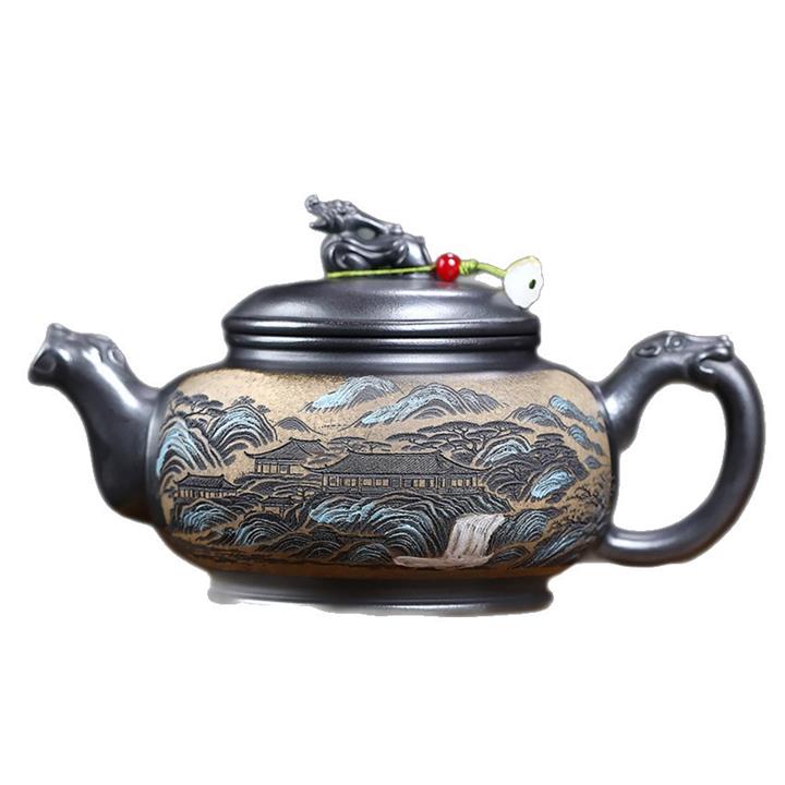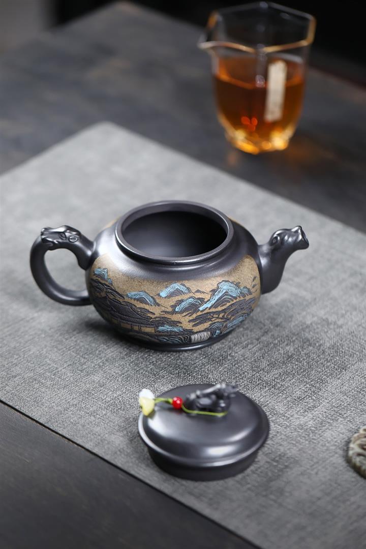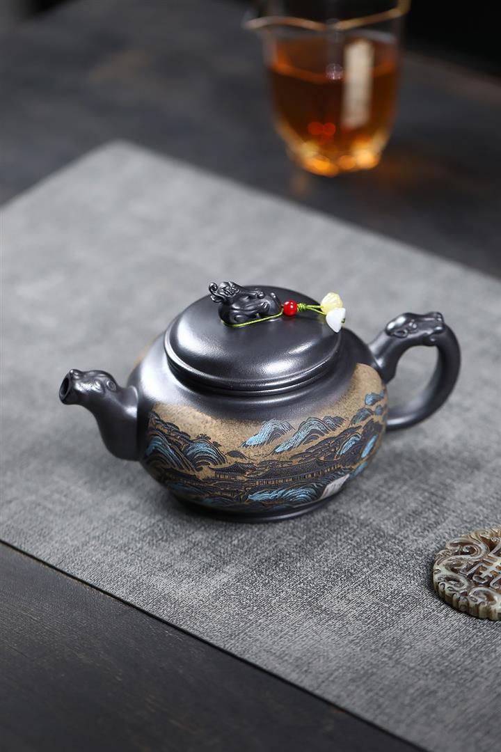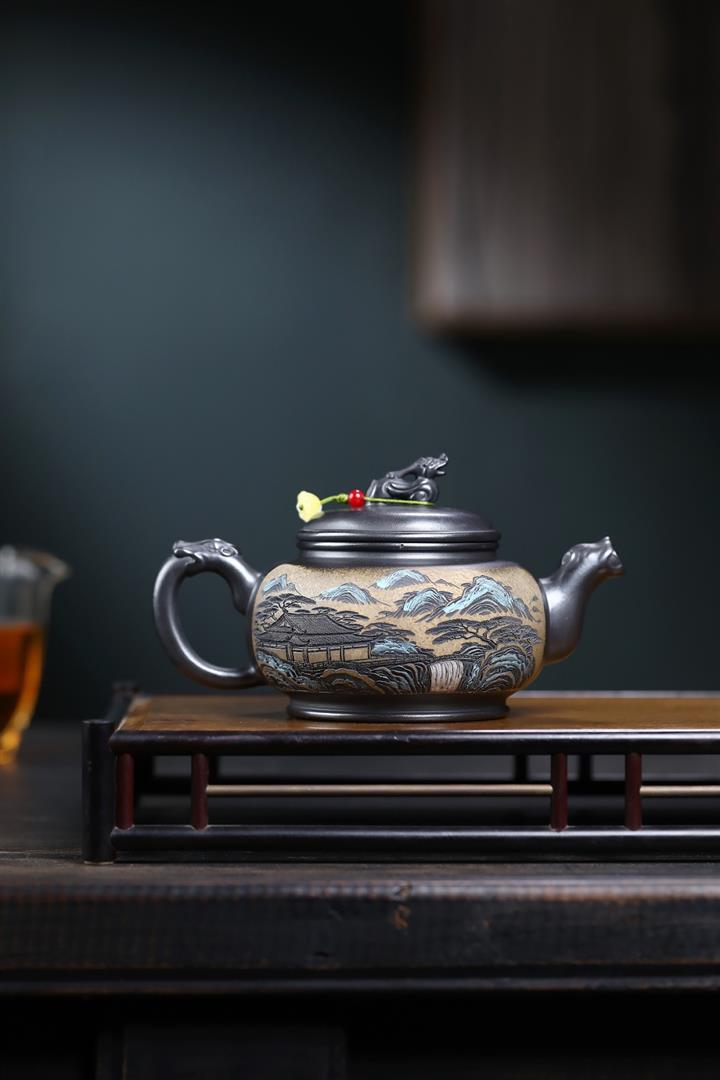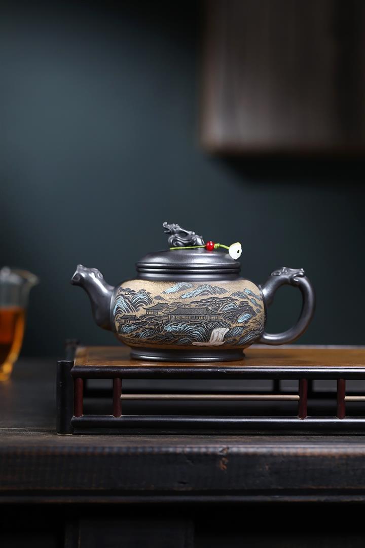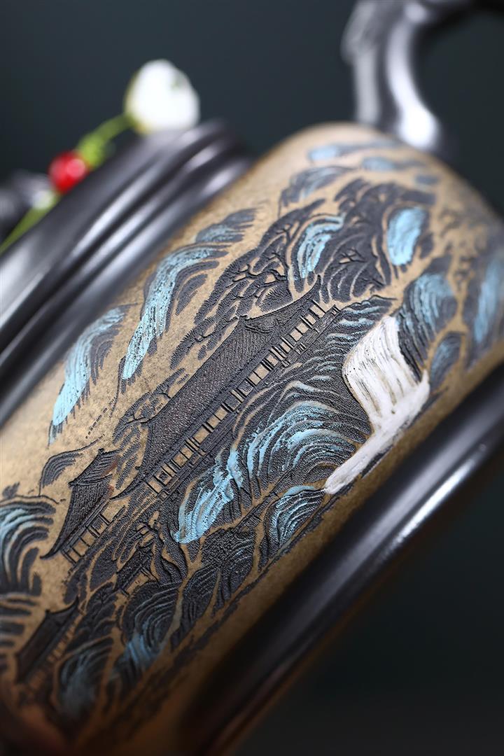 410cc原礦石黃泥彩刻蓬萊勝景茶壺POT8988