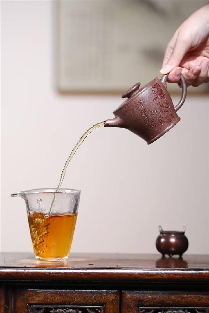 【泥料特點】砂土氣重,似淳實農民,日久使用,漸露鋒芒,養成變化,溫潤莊重。紫砂是壹種雙重氣孔結構的多孔性材質,氣孔微細,密度高。用紫砂壺沏茶,不失原味,且香不渙散,得茶之真香真味。紫砂使用越久,壺身色澤越發光亮照人,氣韻溫雅。紫砂壺長久使用器身會因撫摸擦拭,變得越發溫潤光澤。