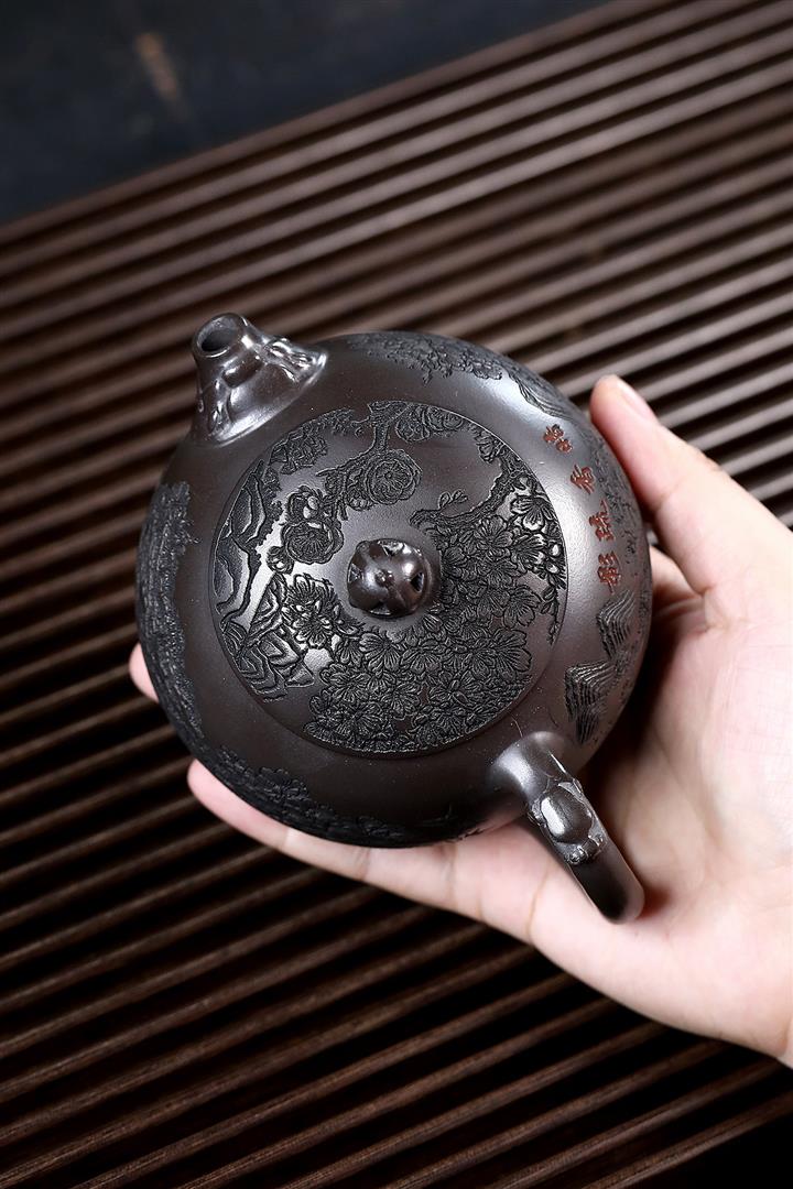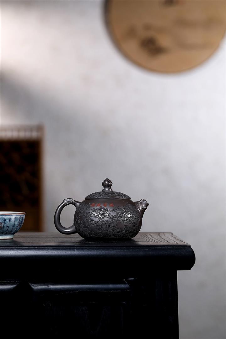 290cc原礦古銅泥彩刻江山攬勝茶壺POT8383