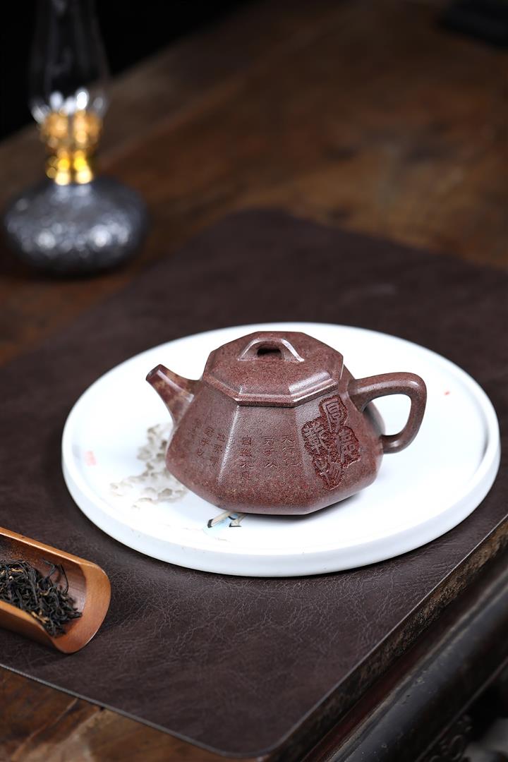 【泥料特點】砂土氣重,似淳實農民,日久使用,漸露鋒芒,養成變化,溫潤莊重。紫砂是壹種雙重氣孔結構的多孔性材質,氣孔微細,密度高。用紫砂壺沏茶,不失原味,且香不渙散,得茶之真香真味。紫砂使用越久,壺身色澤越發光亮照人,氣韻溫雅。紫砂壺長久使用器身會因撫摸擦拭,變得越發溫潤光澤。