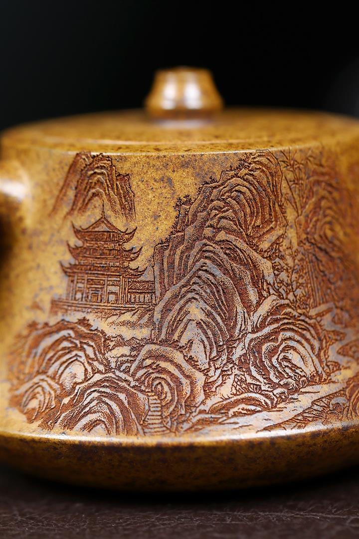 280cc原礦墨綠泥滿刻鯉躍荷塘茶壺POT8320