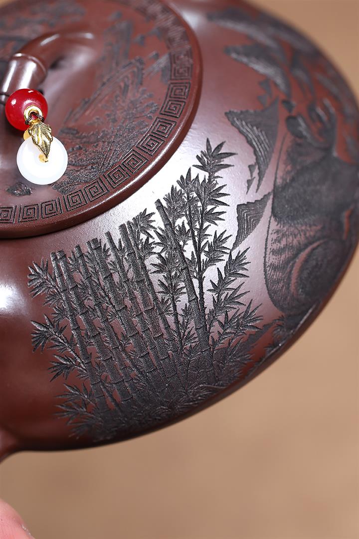 240cc原礦石紅刻繪熊貓竹瓢茶壺POT9276