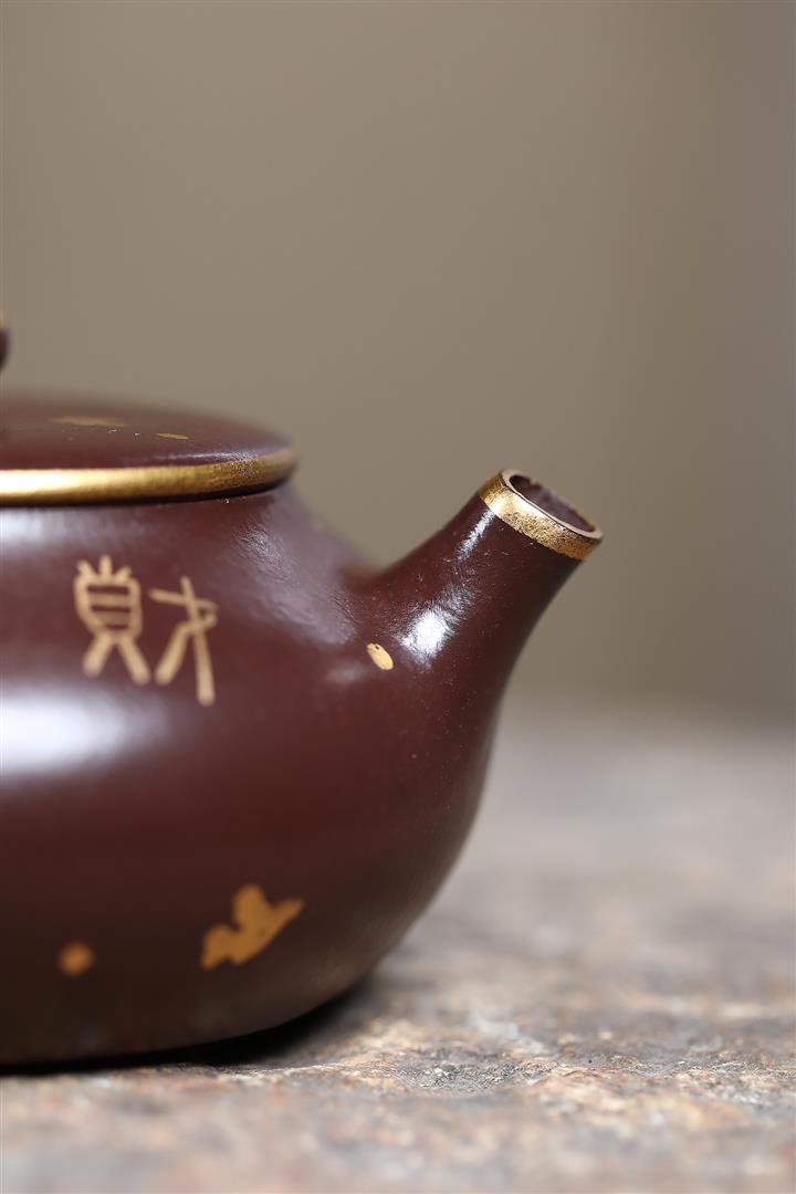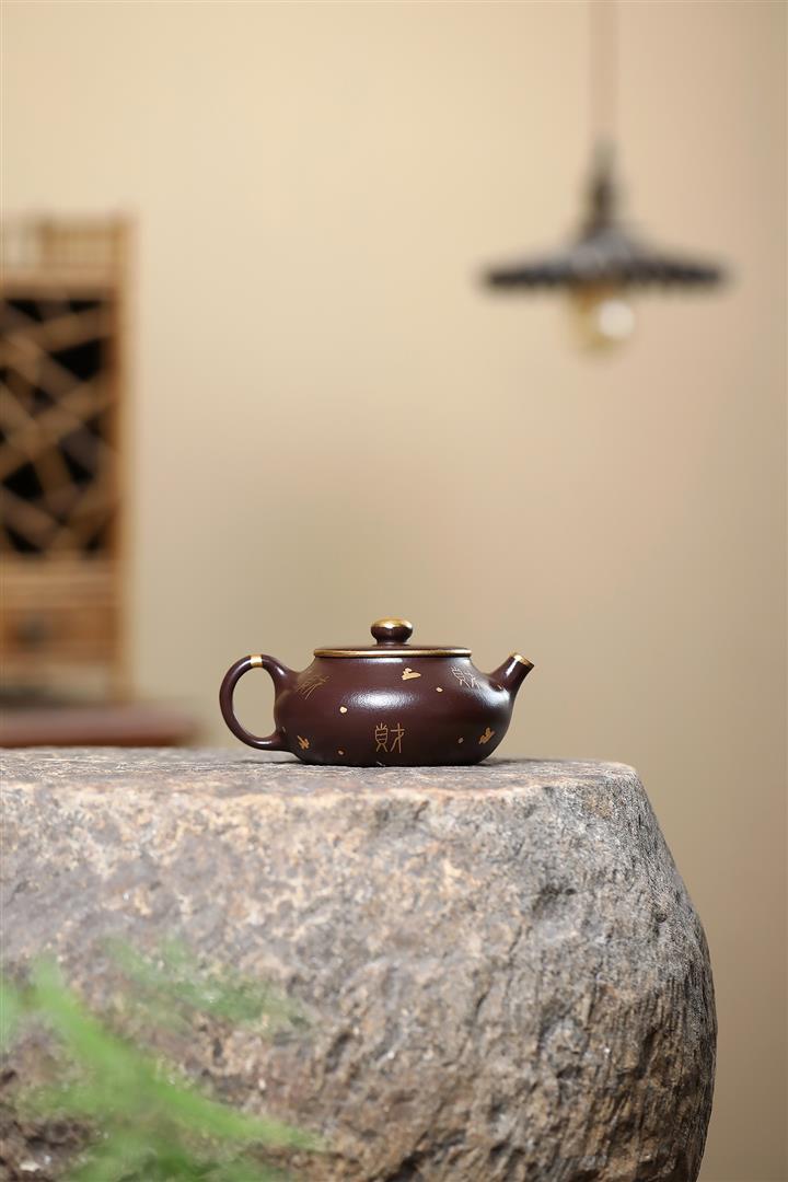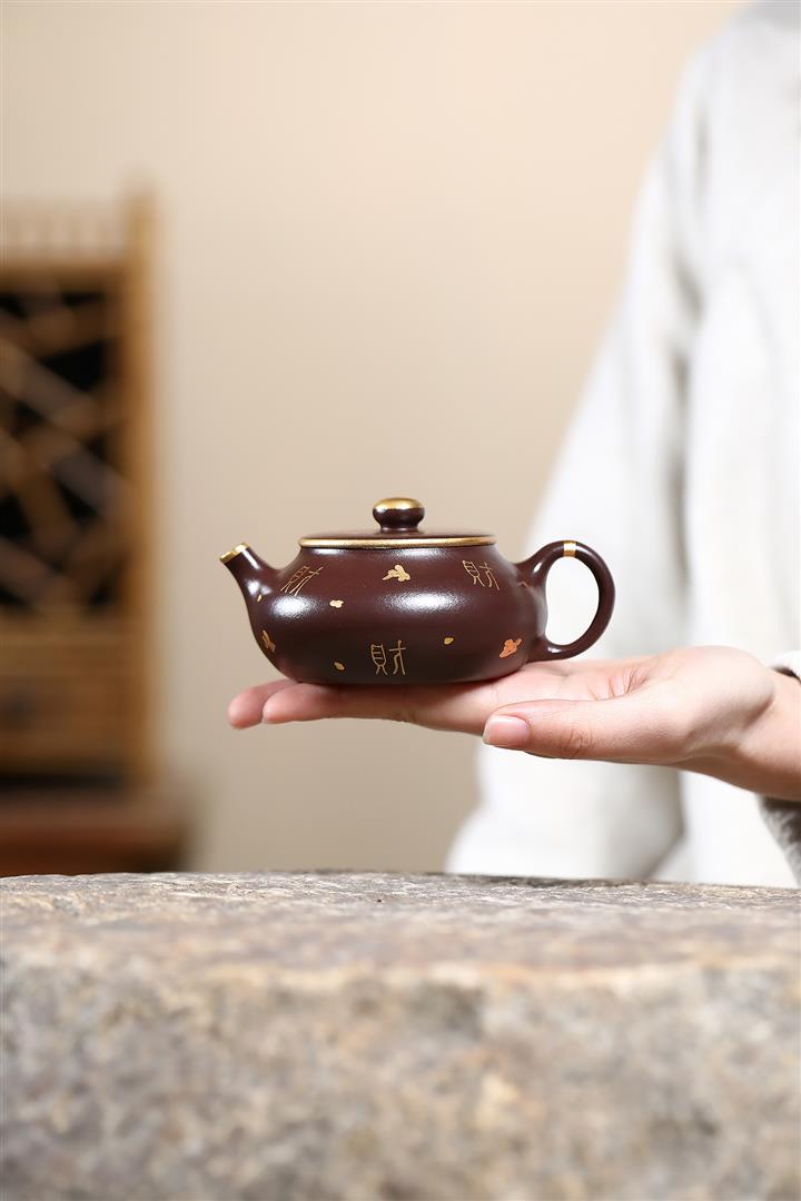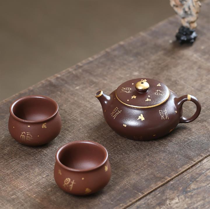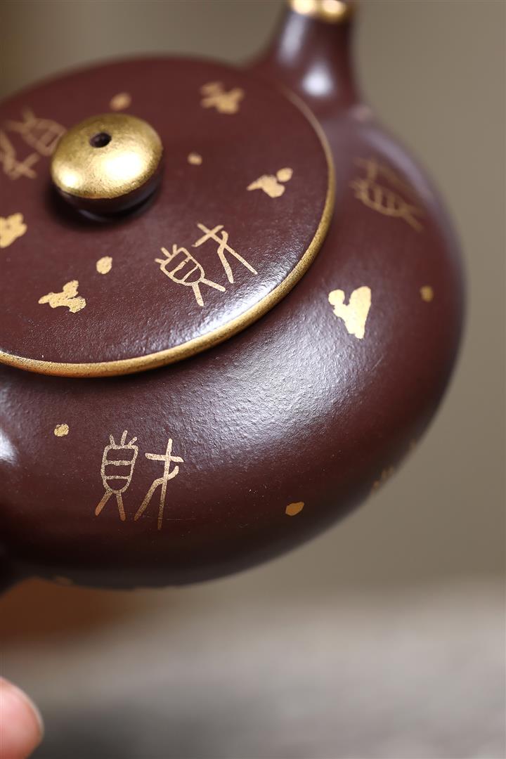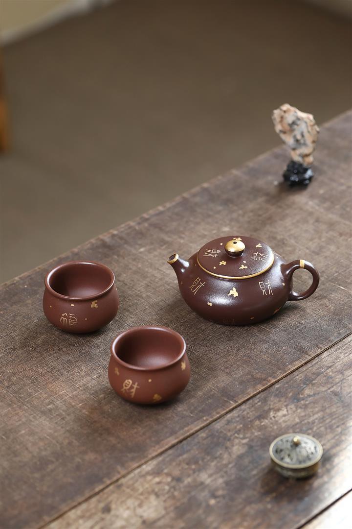 160cc原礦紫泥壹壺兩杯描金扁柿茶壺POT9282