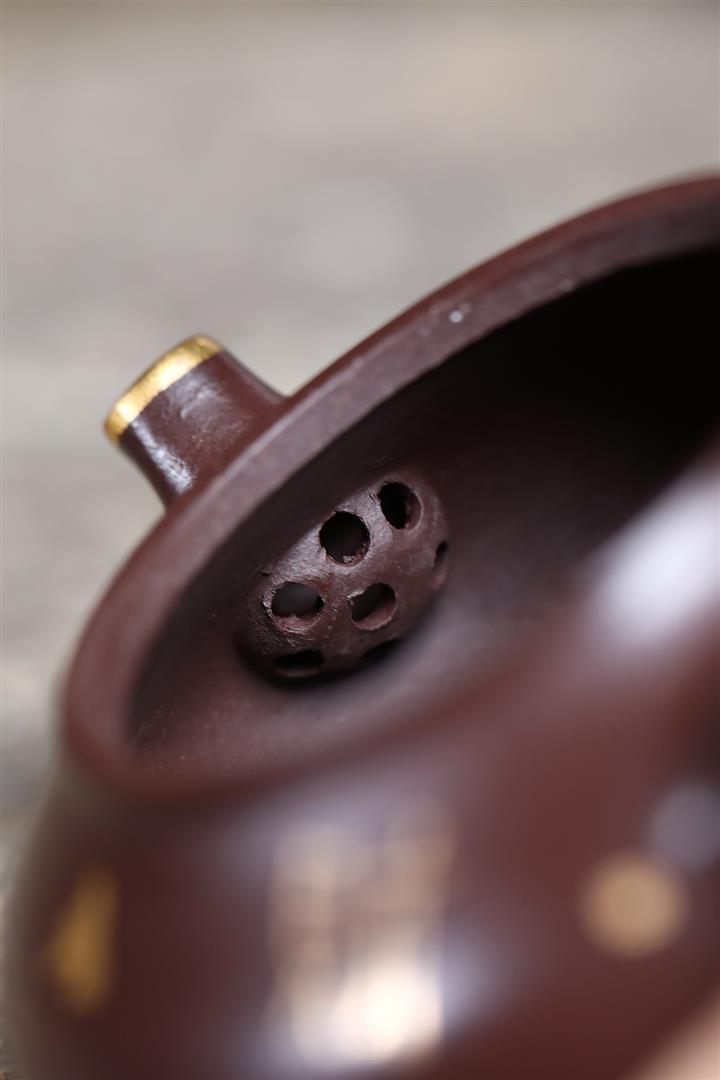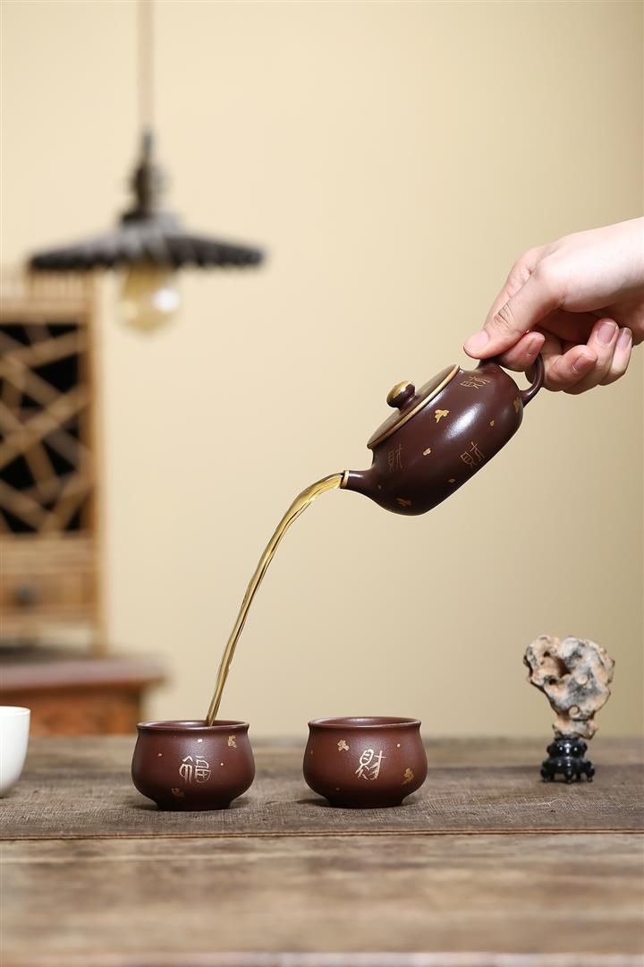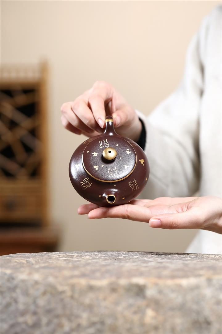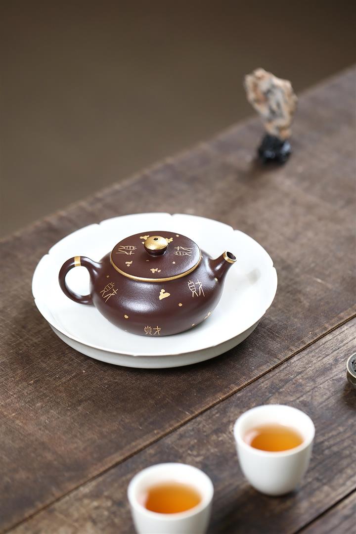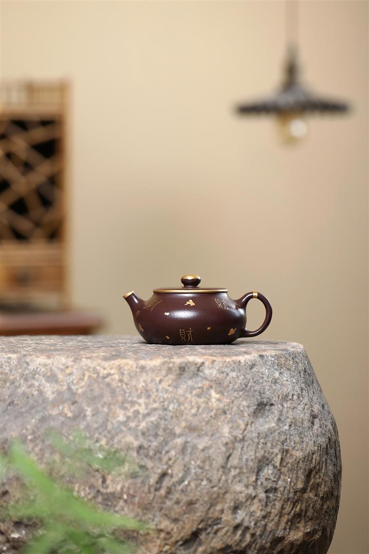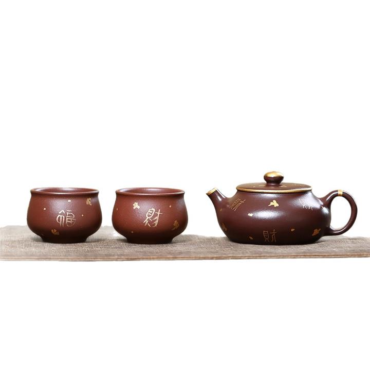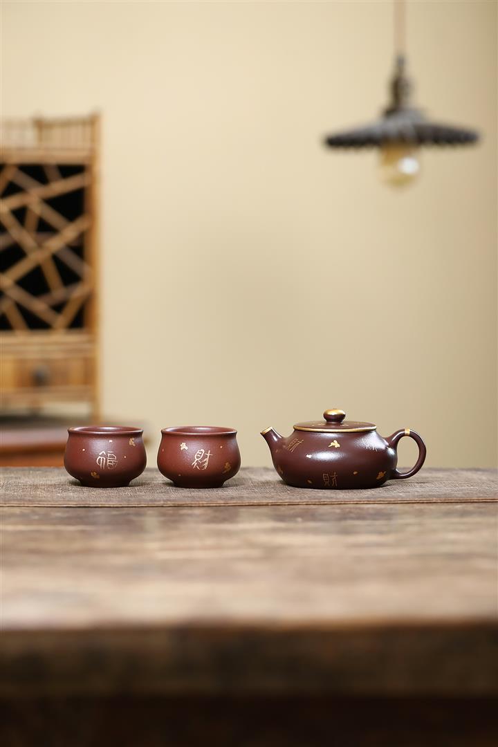 160cc原礦紫泥壹壺兩杯描金扁柿茶壺POT9282