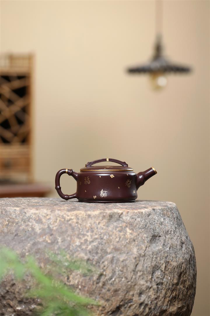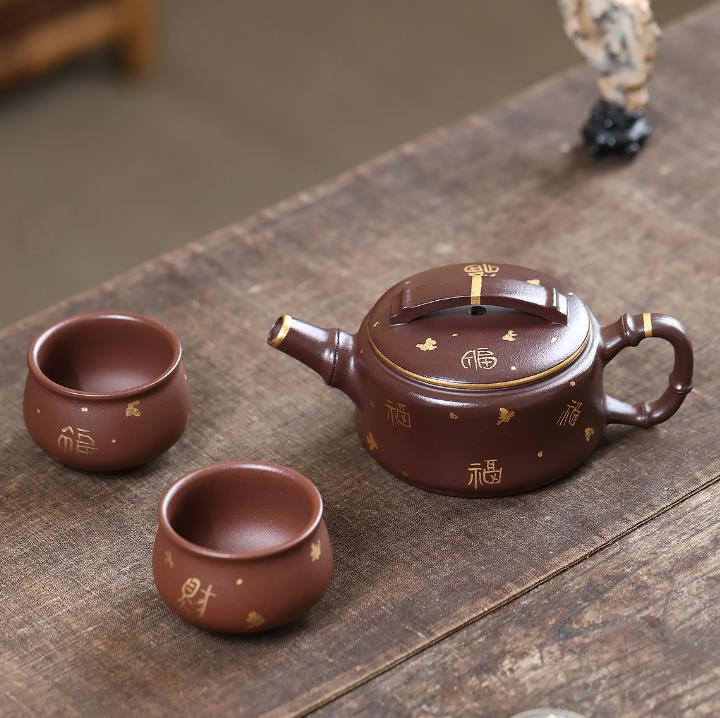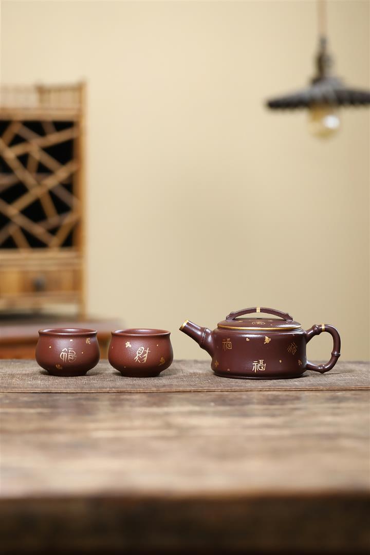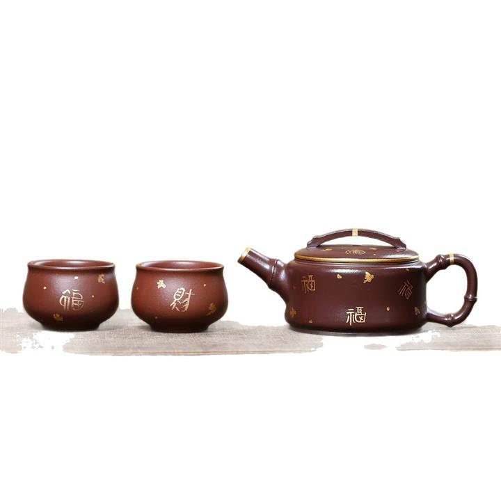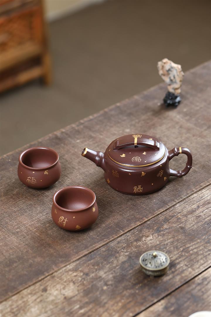 190cc原礦紫泥描金竹節漢瓦壹壺兩杯茶壺POT9286