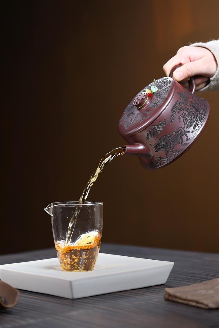 【泥料特點】砂土氣重,似淳實農民,日久使用,漸露鋒芒,養成變化,溫潤莊重。紫砂是壹種雙重氣孔結構的多孔性材質,氣孔微細,密度高。用紫砂壺沏茶,不失原味,且香不渙散,得茶之真香真味。紫砂使用越久,壺身色澤越發光亮照人,氣韻溫雅。紫砂壺長久使用器身會因撫摸擦拭,變得越發溫潤光澤。