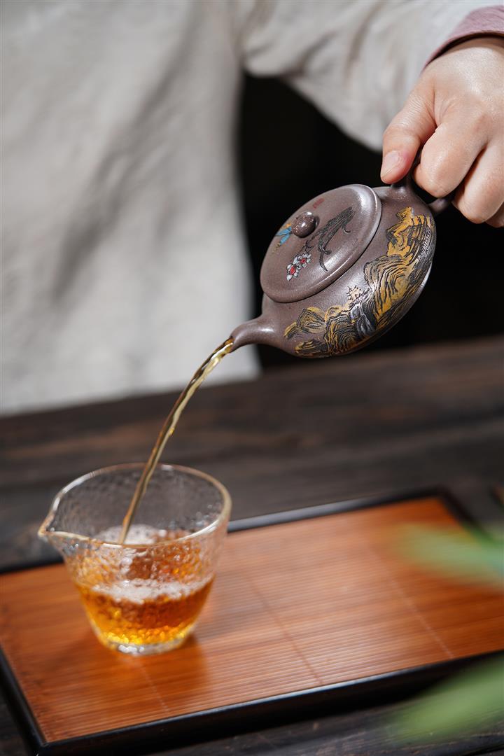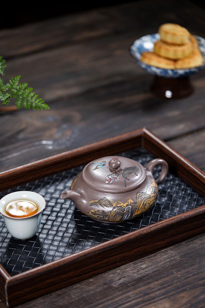 【泥料特點】砂土氣重,似淳實農民,日久使用,漸露鋒芒,養成變化,溫潤莊重。紫砂是壹種雙重氣孔結構的多孔性材質,氣孔微細,密度高。用紫砂壺沏茶,不失原味,且香不渙散,得茶之真香真味。紫砂使用越久,壺身色澤越發光亮照人,氣韻溫雅。紫砂壺長久使用器身會因撫摸擦拭,變得越發溫潤光澤。