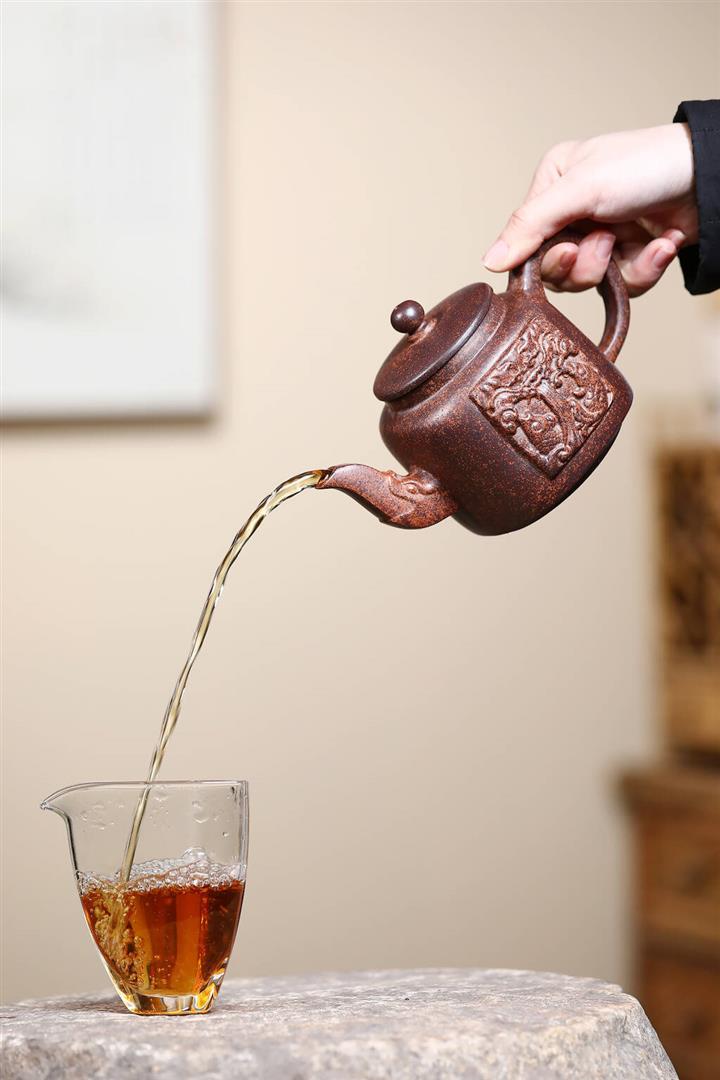 【泥料特點】砂土氣重,似淳實農民,日久使用,漸露鋒芒,養成變化,溫潤莊重。紫砂是壹種雙重氣孔結構的多孔性材質,氣孔微細,密度高。用紫砂壺沏茶,不失原味,且香不渙散,得茶之真香真味。紫砂使用越久,壺身色澤越發光亮照人,氣韻溫雅。紫砂壺長久使用器身會因撫摸擦拭,變得越發溫潤光澤。