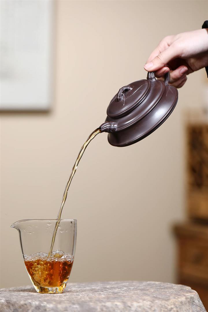 【泥料特點】砂土氣重,似淳實農民,日久使用,漸露鋒芒,養成變化,溫潤莊重。紫砂是壹種雙重氣孔結構的多孔性材質,氣孔微細,密度高。用紫砂壺沏茶,不失原味,且香不渙散,得茶之真香真味。紫砂使用越久,壺身色澤越發光亮照人,氣韻溫雅。紫砂壺長久使用器身會因撫摸擦拭,變得越發溫潤光澤。