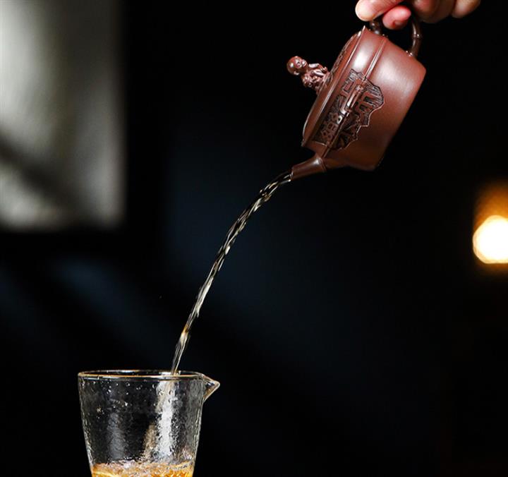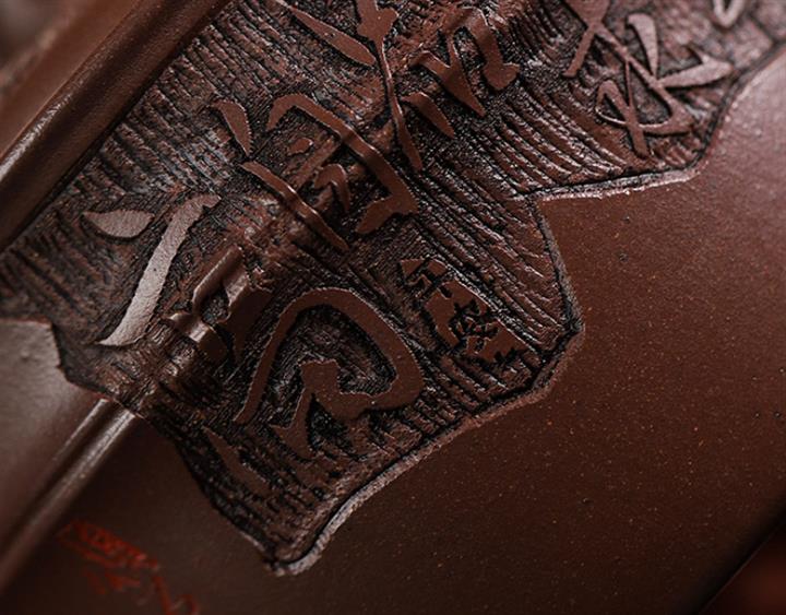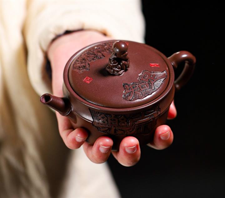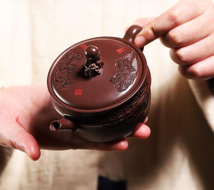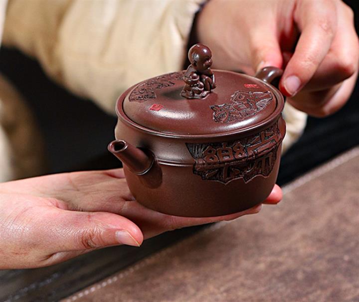 【泥料特點】砂土氣重,似淳實農民,日久使用,漸露鋒芒,養成變化,溫潤莊重。紫砂是壹種雙重氣孔結構的多孔性材質,氣孔微細,密度高。用紫砂壺沏茶,不失原味,且香不渙散,得茶之真香真味。紫砂使用越久,壺身色澤越發光亮照人,氣韻溫雅。紫砂壺長久使用器身會因撫摸擦拭,變得越發溫潤光澤。