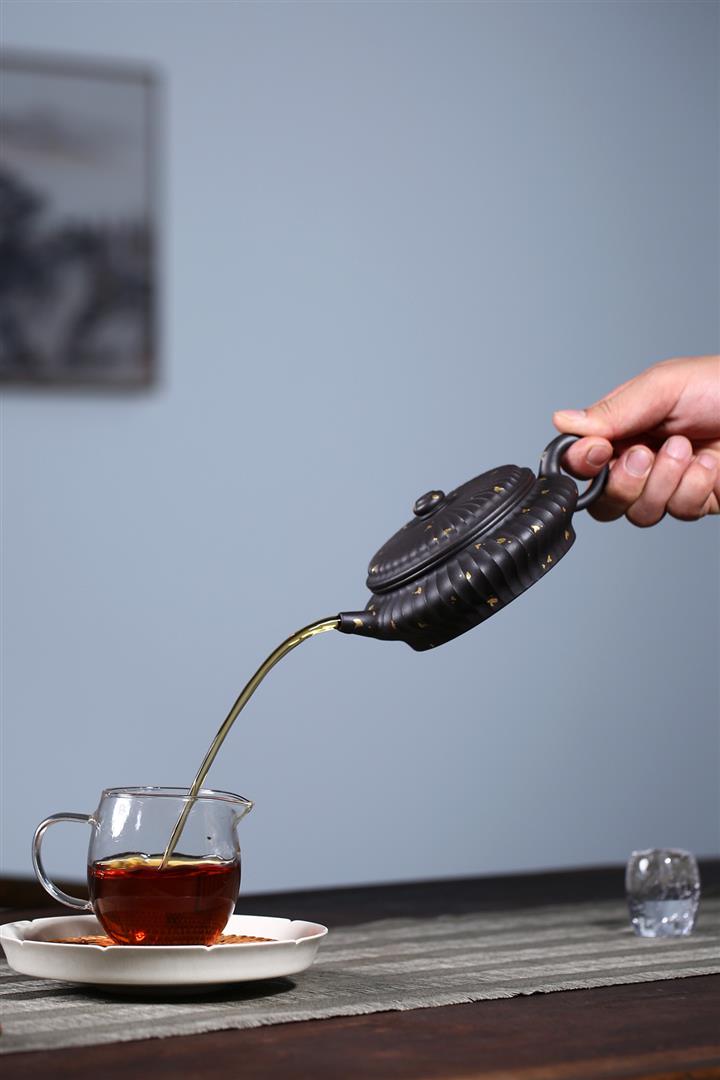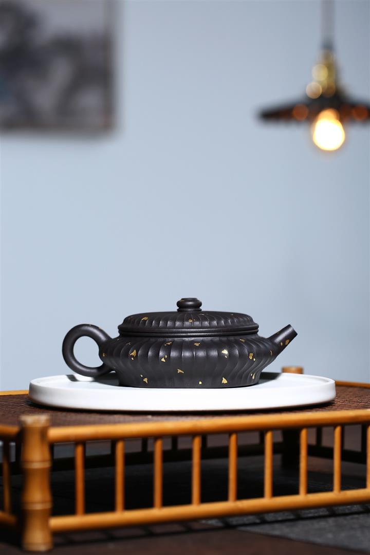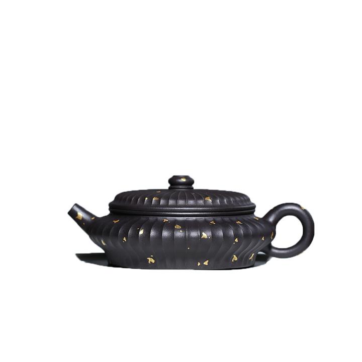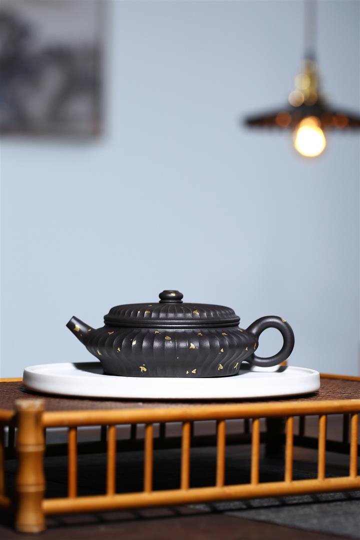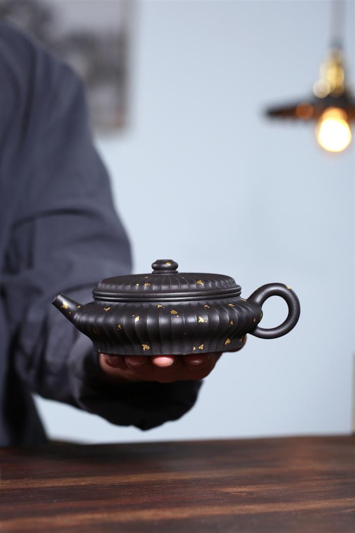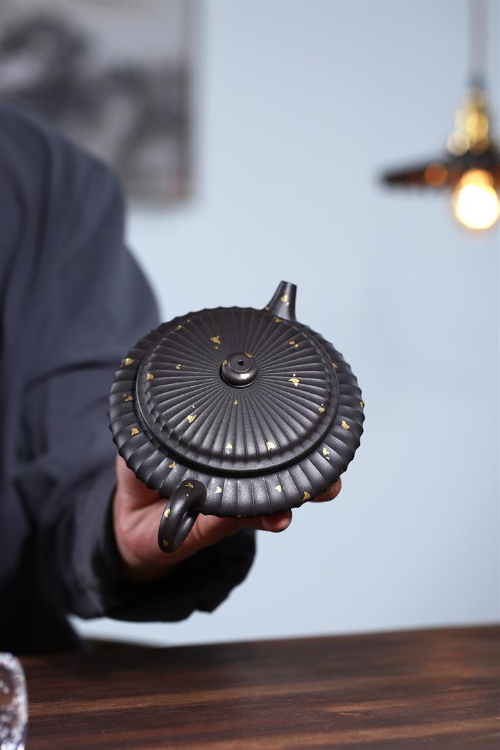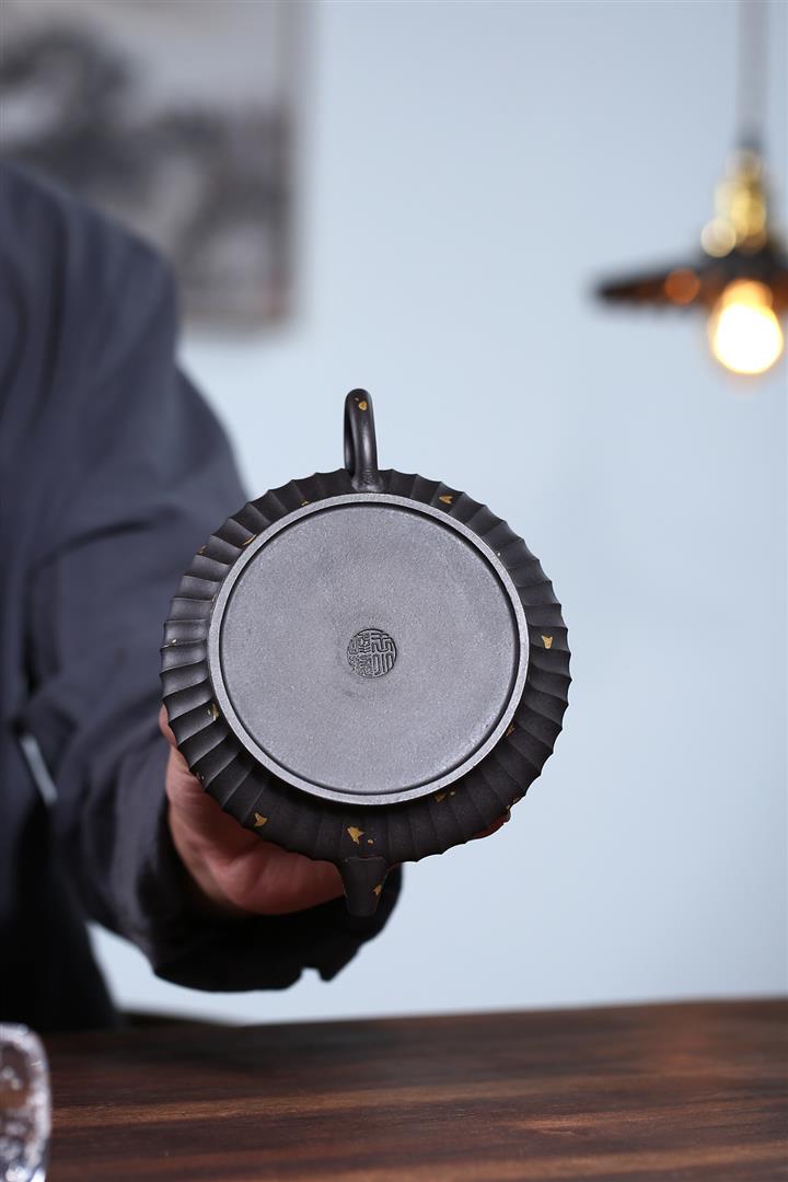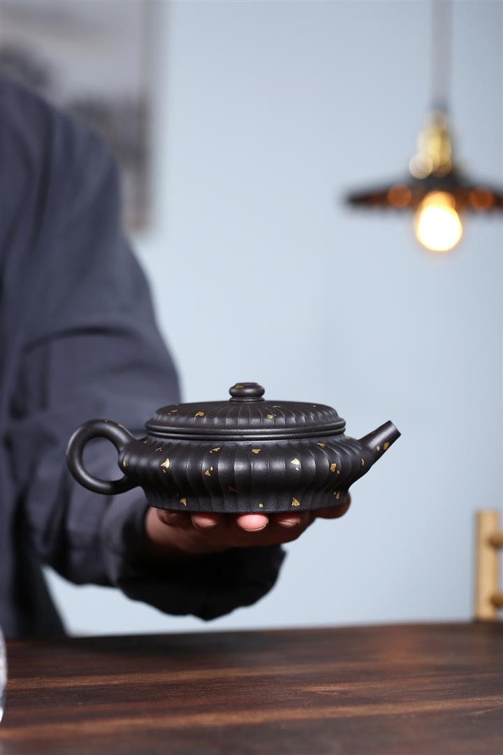 280cc原礦黑料描撒灑金筋紋虛扁泡茶壺POT9934