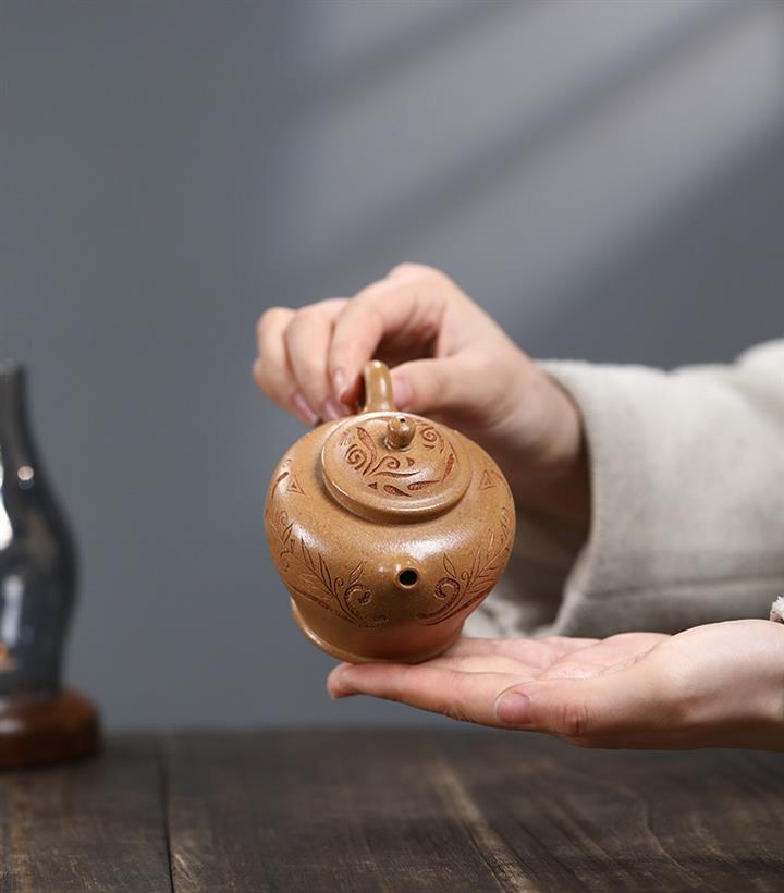 【泥料特點】砂土氣重,似淳實農民,日久使用,漸露鋒芒,養成變化,溫潤莊重。紫砂是壹種雙重氣孔結構的多孔性材質,氣孔微細,密度高。用紫砂壺沏茶,不失原味,且香不渙散,得茶之真香真味。紫砂使用越久,壺身色澤越發光亮照人,氣韻溫雅。紫砂壺長久使用器身會因撫摸擦拭,變得越發溫潤光澤。