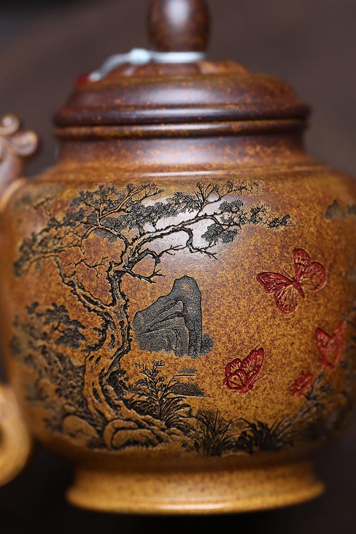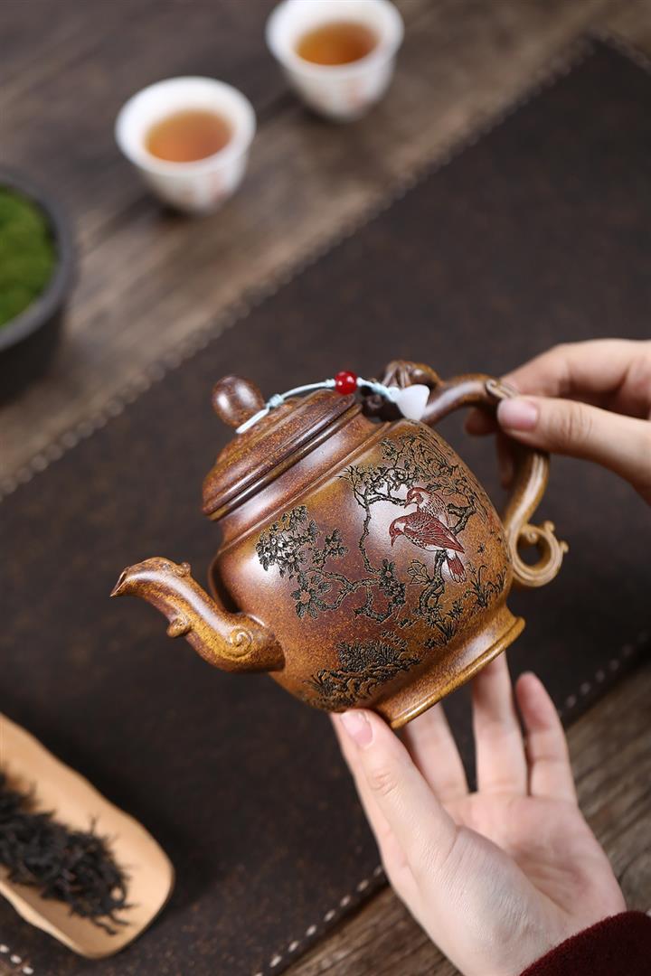 【泥料特點】砂土氣重,似淳實農民,日久使用,漸露鋒芒,養成變化,溫潤莊重。紫砂是壹種雙重氣孔結構的多孔性材質,氣孔微細,密度高。用紫砂壺沏茶,不失原味,且香不渙散,得茶之真香真味。紫砂使用越久,壺身色澤越發光亮照人,氣韻溫雅。紫砂壺長久使用器身會因撫摸擦拭,變得越發溫潤光澤。